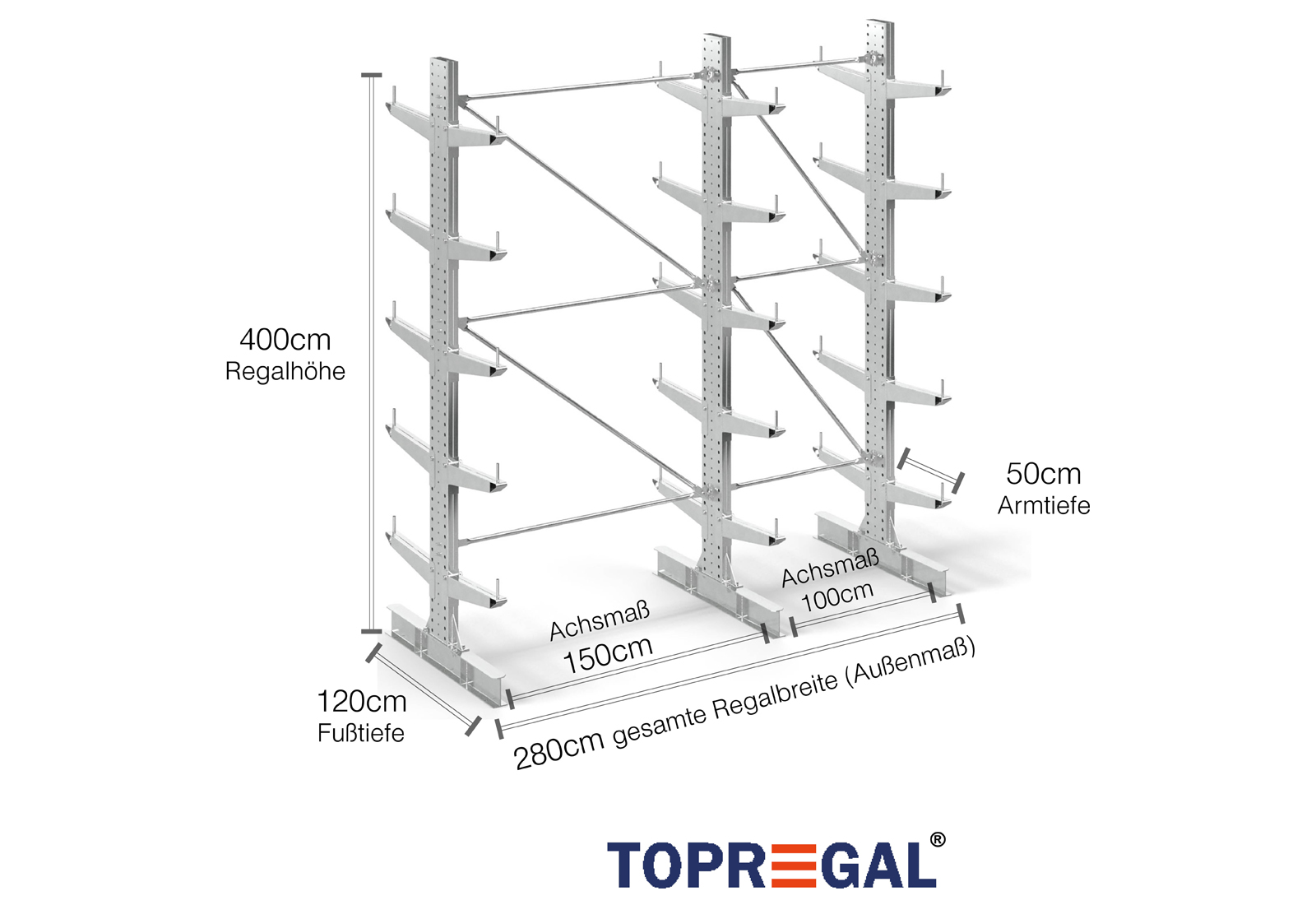 2,8 m Kragarmregal KR3000 / Feuerverzinkt / Doppelseitig / 4 m hoch / 50 cm Armtiefe / 5 Ebenen