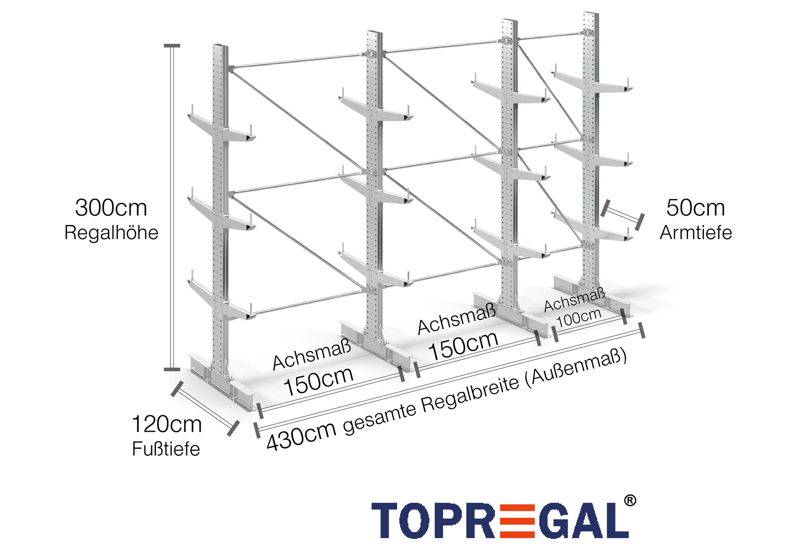 Dieses Kragarmregal in doppelseitiger Ausführung mit einer Breite von 4,3 m ist 3 m hoch, hat eine Gesamttiefe von 120 cm und verfügt über 3 Kragarmebenen, mit einer Armtiefe von 50 cm. Die maximale Belastung pro Arm beträgt hierbei maximal 500 kg. Die Kragarme können im Rastermaß von 50 mm individuell eingehängt und per Sicherungsbolzen und -stift gesichert werden. Auch die Fußteile können (je nach Gut) als Lagerebene genutzt werden. Um die Ladung vor versehentlichem Abrutschen zu schützen, kann am Ende eines jeden Kragarms eine Abrollsicherung eingesteckt werden. Diese ist standardmäßig im Lieferumfang enthalten.