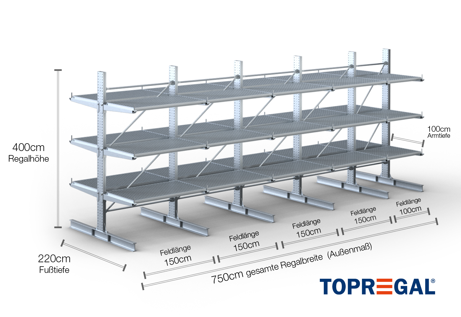 Dieses Kragarmregal in doppelseitiger Ausführung mit einer Breite von 7,5 m ist 4 m hoch, hat eine Gesamttiefe von 220 cm und verfügt über 3 Kragarmebenen, mit einer Armtiefe von 100 cm. Die maximale Belastung pro Arm beträgt hierbei maximal 500 kg. Die Kragarme können im Rastermaß von 50 mm individuell eingehängt und per Sicherungsbolzen und -stift gesichert werden. Auch die Fußteile können (je nach Gut) als Lagerebene genutzt werden. Um die Ladung vor versehentlichem Abrutschen zu schützen, kann am Ende eines jeden Kragarms eine Abrollsicherung eingesteckt werden. Diese ist standardmäßig im Lieferumfang enthalten.