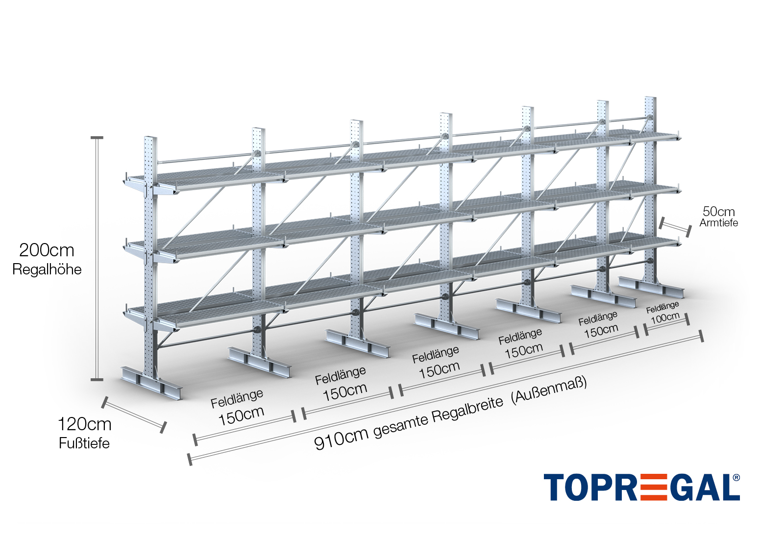 Die verfügbaren Feldergrößen variieren je nach spezifischem Kragarmregal-Modell: