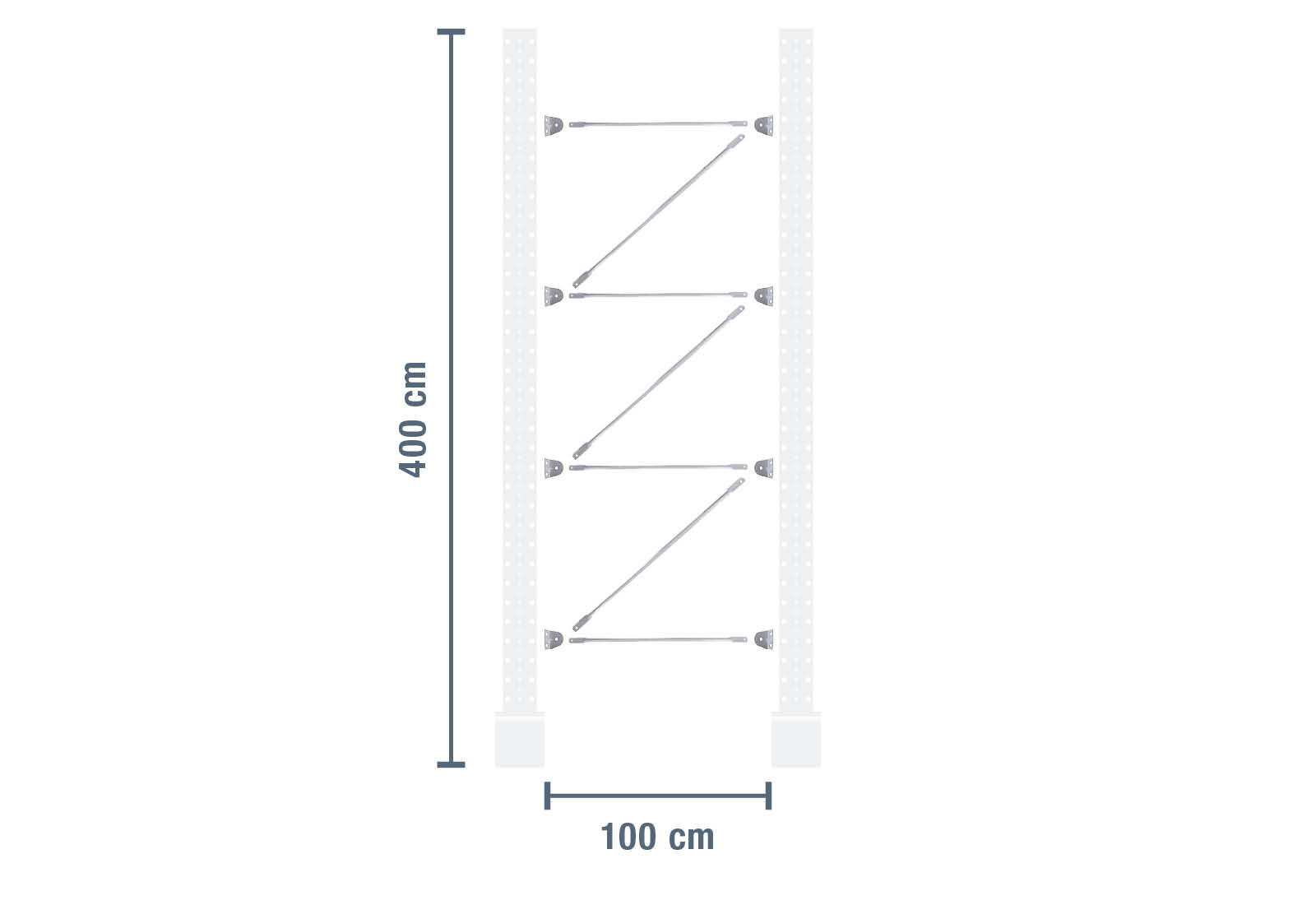 Diese Kragarmregal-Verstrebung zeichnet sich durch ihre robuste Bauweise aus und dient der Verbindung von zwei gleich hohen 4.000 mm Kragarmregal-Ständern, um ein funktionstüchtiges Regalfeld aufzubauen.