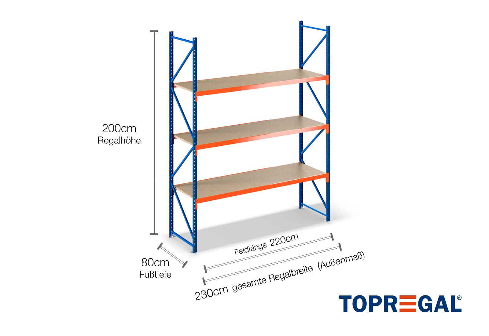 2,3 m Lagerregal LR2000 / 80 cm tief / 2 m hoch / 3 Ebenen / Auflage Holz