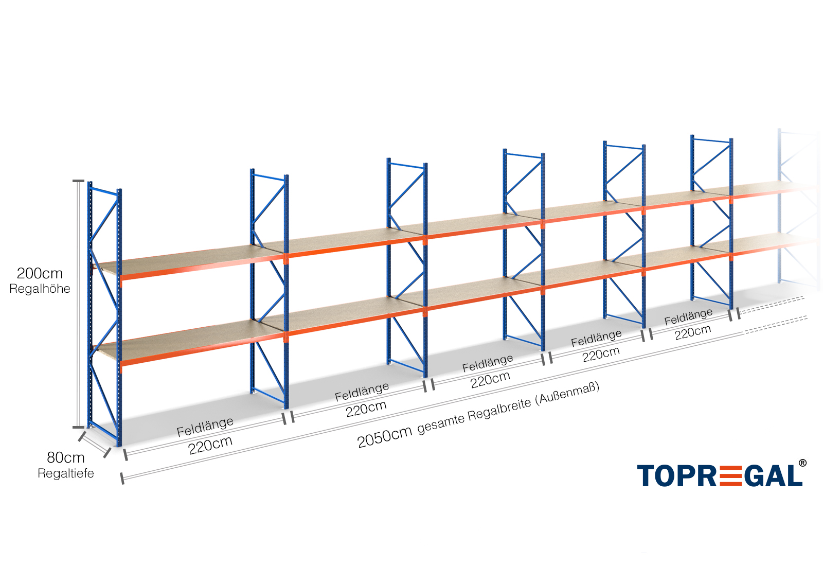 20,5 m Lagerregal LR2000 / 80 cm tief / 2 m hoch / 2 Ebenen / Auflage Holz