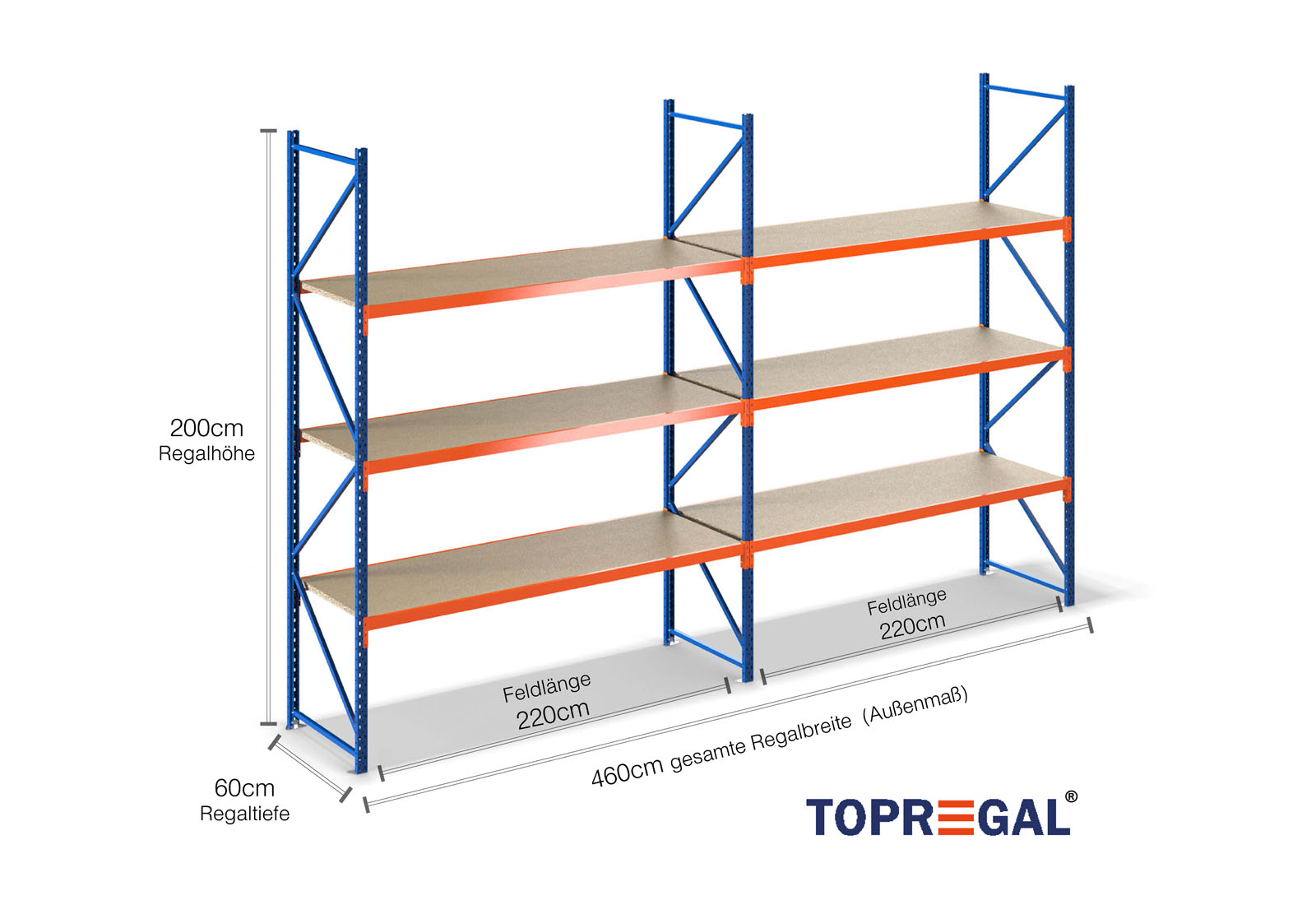 4,6 m Lagerregal LR2000 / 60 cm tief / 2 m hoch / 3 Ebenen / Auflage Holz