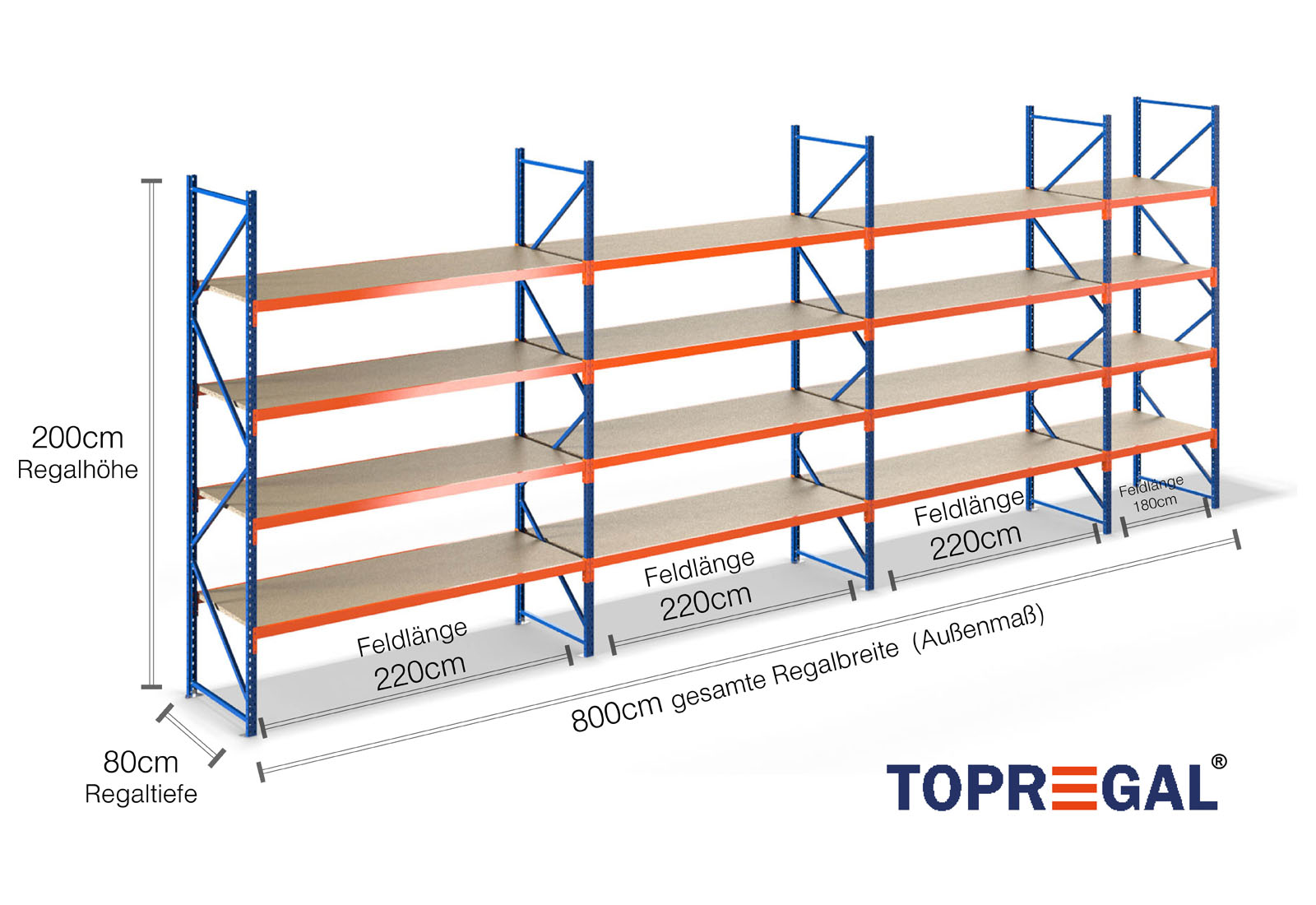 8,0 m Lagerregal LR2000 / 80 cm tief / 2 m hoch / 4 Ebenen / Auflage Holz