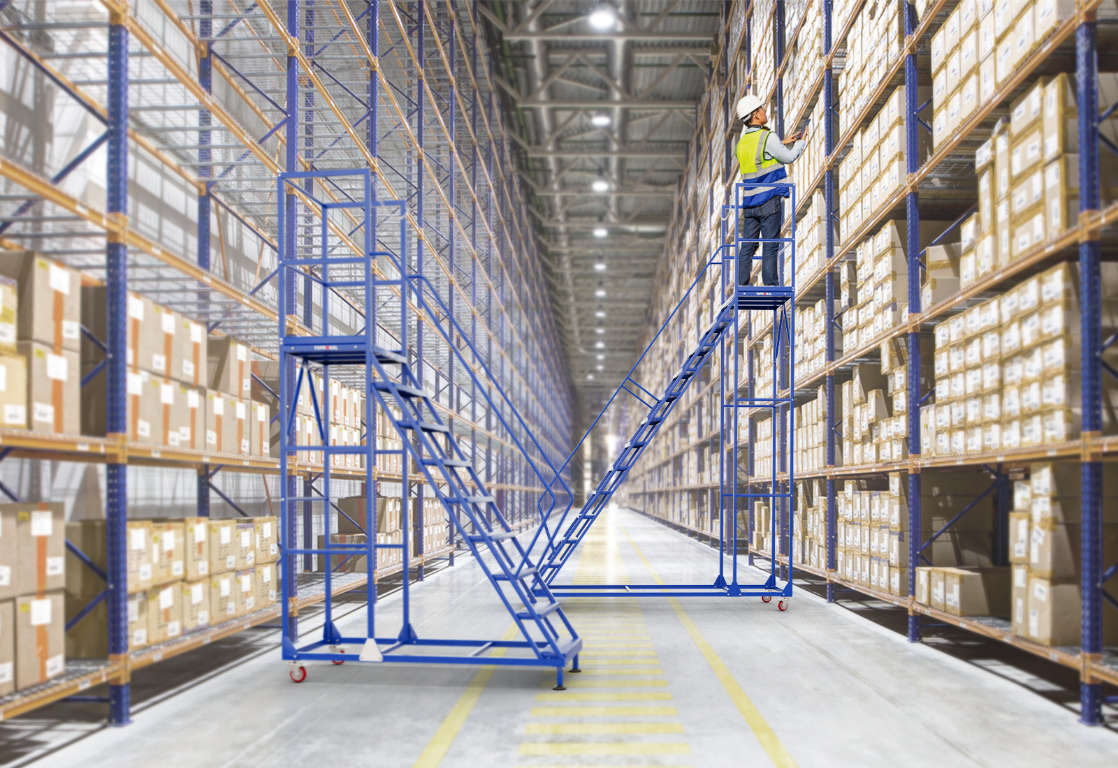 - 1 x mobile Podestleiter PL300/12 aus Karbonstahl von TOPREGAL (2.500 mm x 800 mm x 4.000 mm)