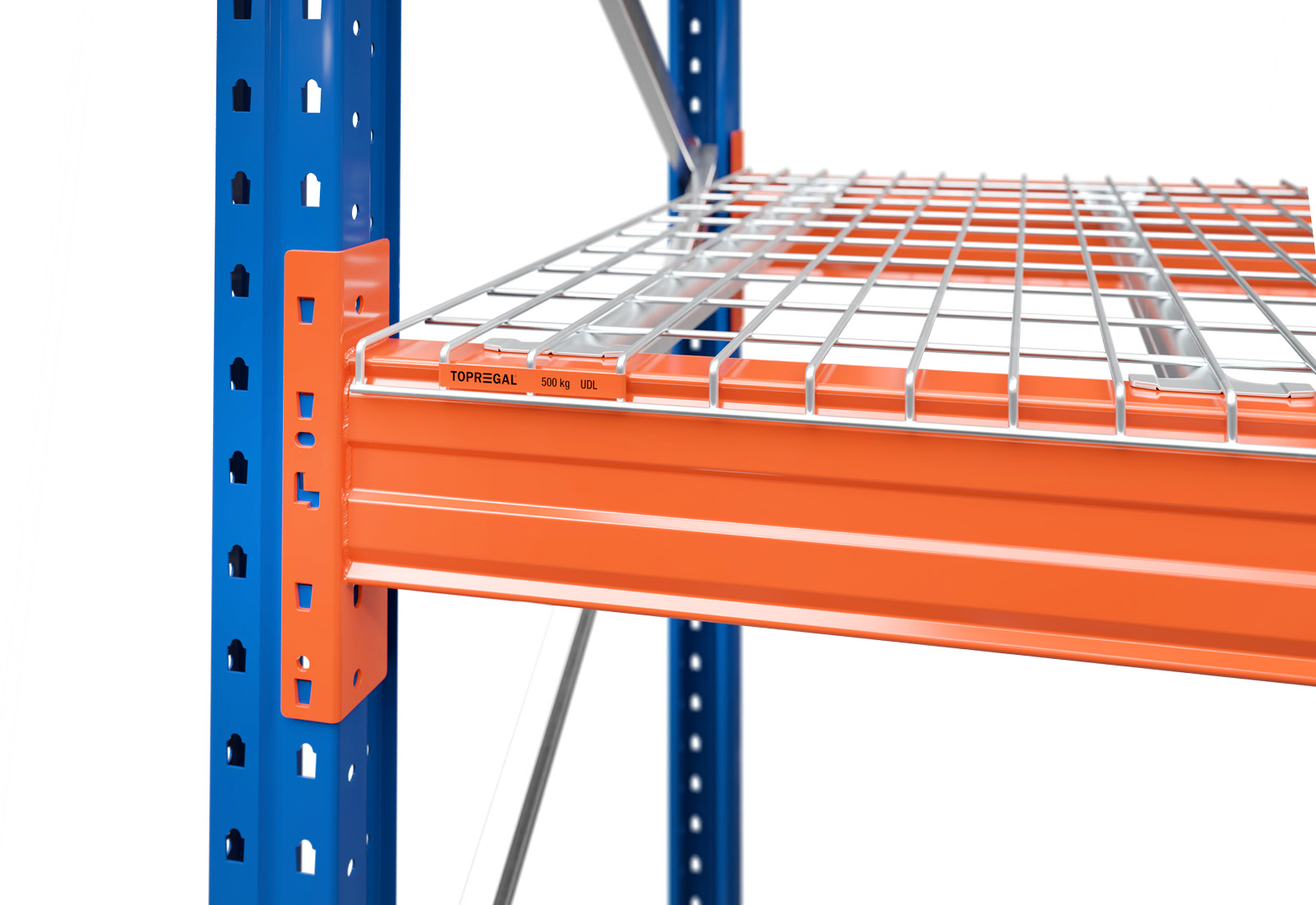 Die nach unten gerichteten, integrierten Tiefenauflagen tragen zusätzlich zur Stablität und Sicherheit Ihres Lagerguts bei. Staub, Dreck und Holzreste können sich so nicht ansammeln. Die Maschenweite beträgt 5 × 10 cm und bietet somit eine offene Fläche von 70 %. Dadurch haben Sie eine perfekte Sicht auf die eingelagerte Ware. Außerdem übertrifft der Gitterboden alle geltenden Normen für Sprinkleranlagen. Die Drahtgitter-Module werden auf die Traversen aufgelegt und fixieren sich durch die spezielle Bauweise, mit dem Überhang von 30 mm auf Vorder- und Rückseite, von selbst.