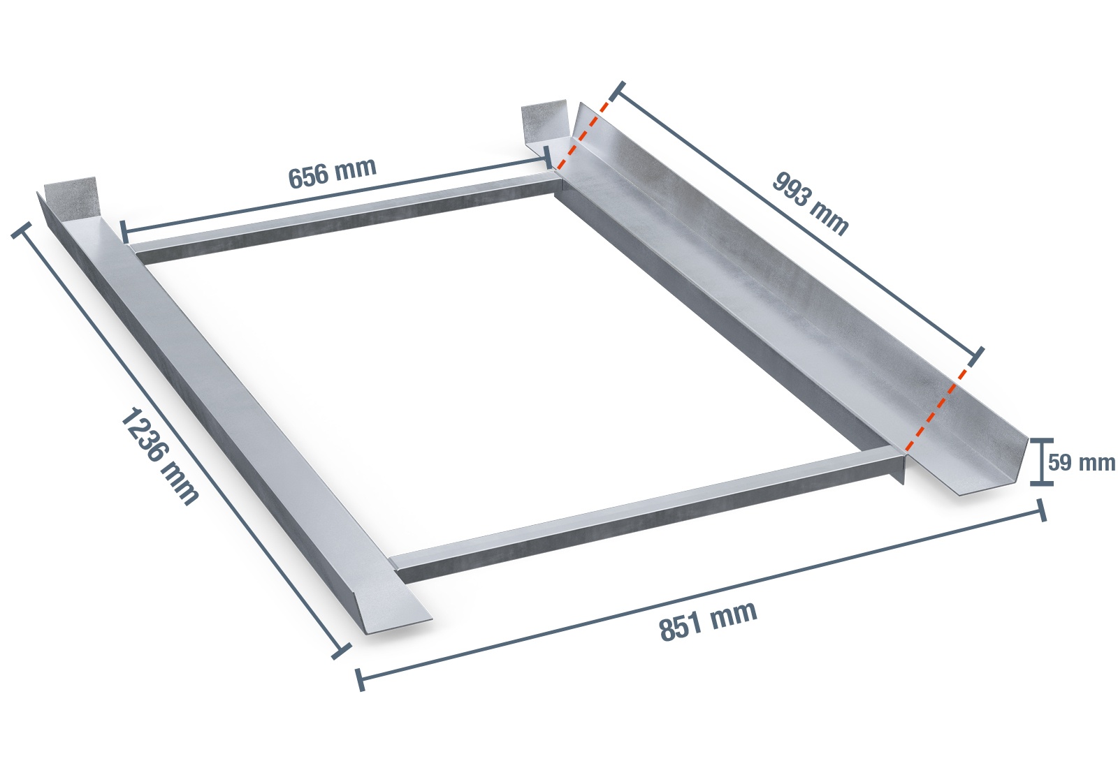 Die Winkelauflage PRWA1100 bietet eine Rahmentiefe von 1.236 mm und eine Breite von 851 mm. Die effektive Nutzfläche beträgt 814 mm x 1217 mm. Somit können Europaletten problemlos platziert und kommissioniert werden. Die Winkelauflage ist insgesamt 99 mm hoch, die Aufkantung allein hat eine Höhe von 59 mm. Die besondere Bauart der Winkelauflage sorgt für viel Stabilität und Sicherheit.