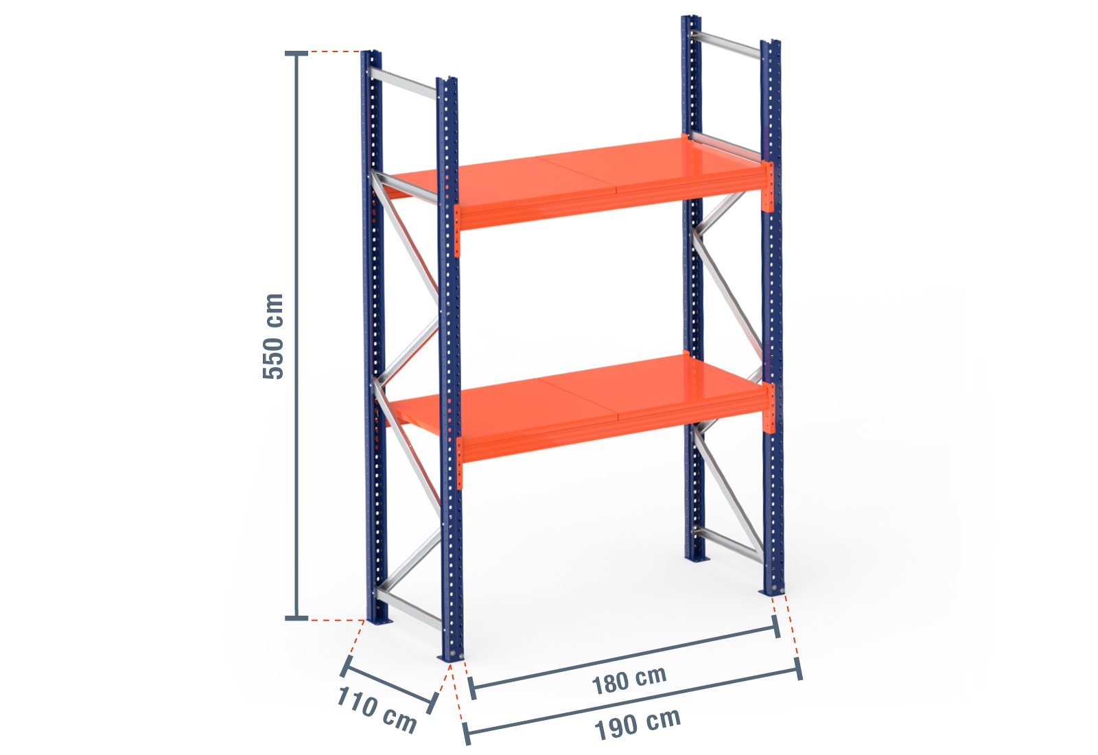 1,9 m Palettenregal PR9000 / 110 cm tief / 5,5 m hoch / 2 Ebenen / Auflage Stahl