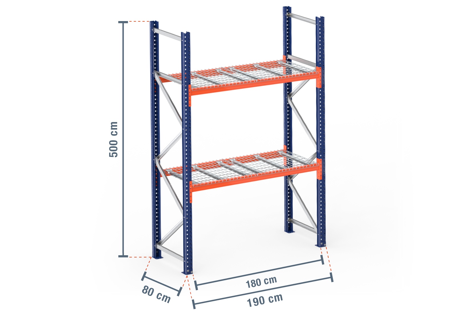 1,9 m Palettenregal PR9000 / 80 cm tief / 5 m hoch / 2 Ebenen / Auflage Drahtgitter