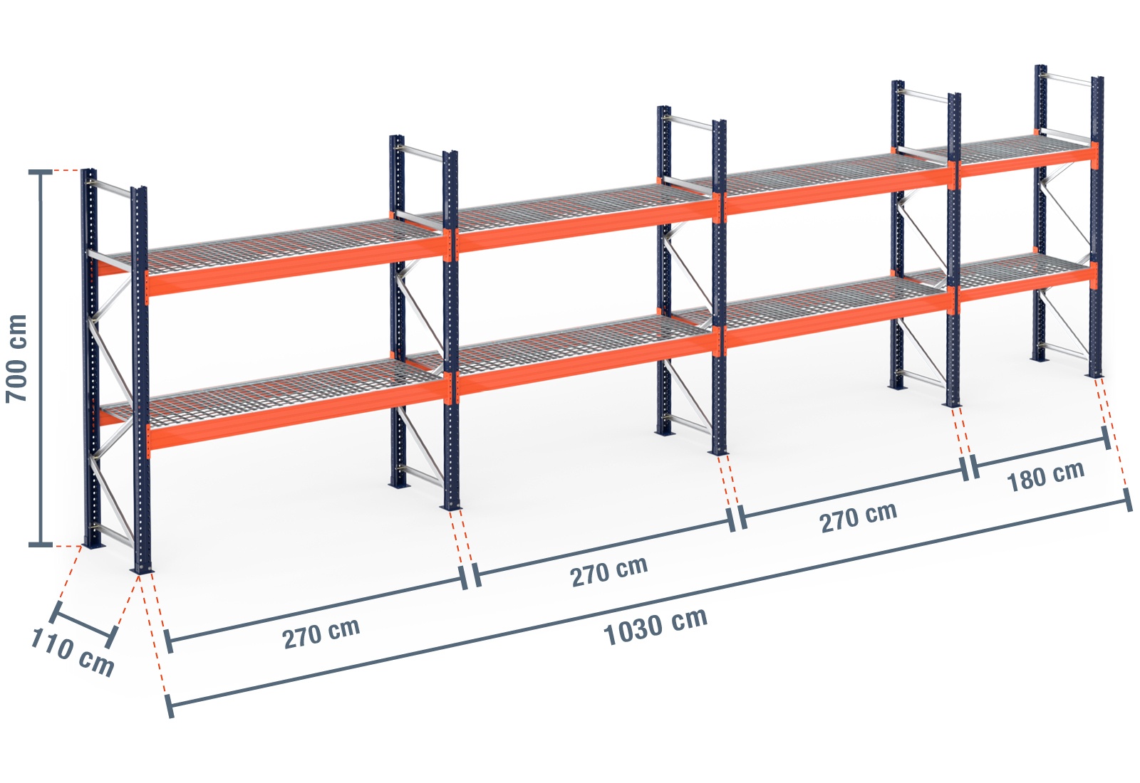 10,3 m Palettenregal PR15000 / 110 cm tief / 7 m hoch / 2 Ebenen / Auflage Gitterrost