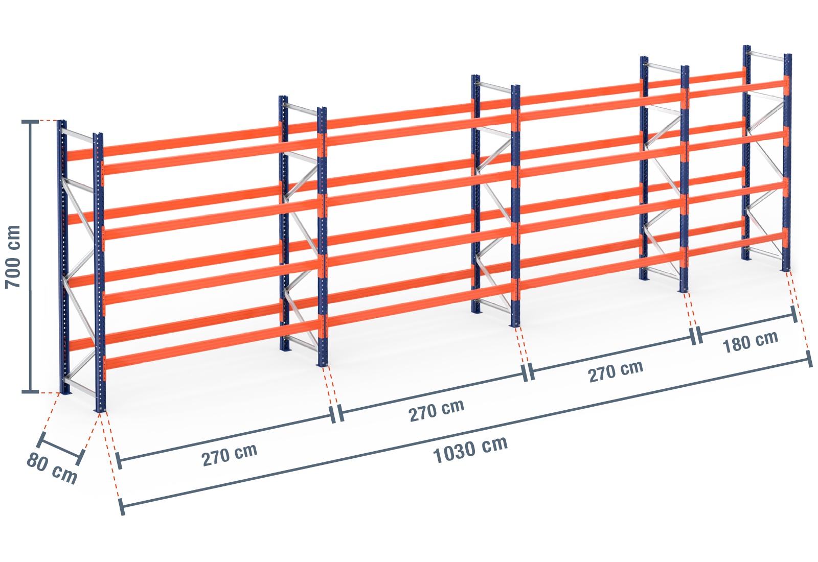10,3 m Palettenregal PR4500 / 80 cm tief / 7 m hoch / 4 Ebenen für 55 Europaletten