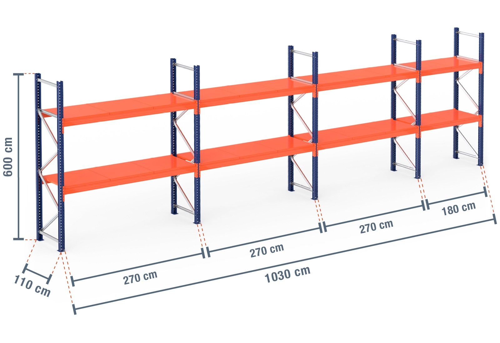 10,3 m Palettenregal PR9000 / 110 cm tief / 6 m hoch / 2 Ebenen / Auflage Stahl