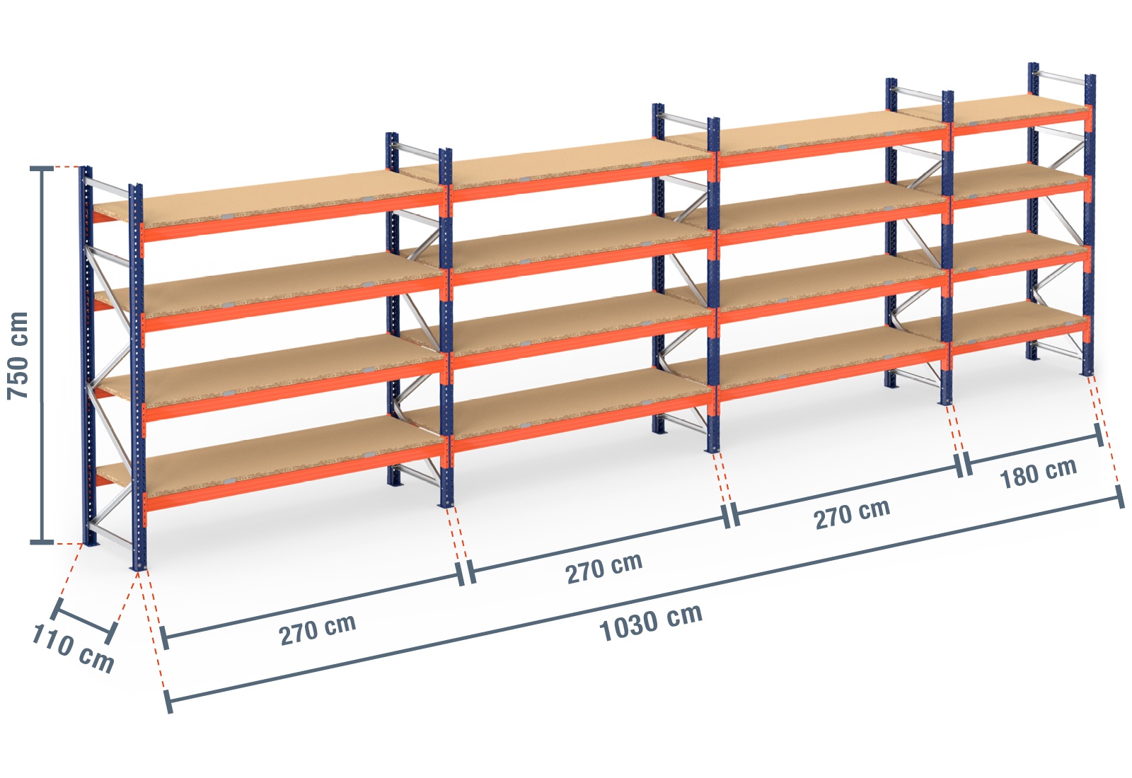 10,3 m Palettenregal PR9000 / 110 cm tief / 7,5 m hoch / 4 Ebenen / Auflage Holz
