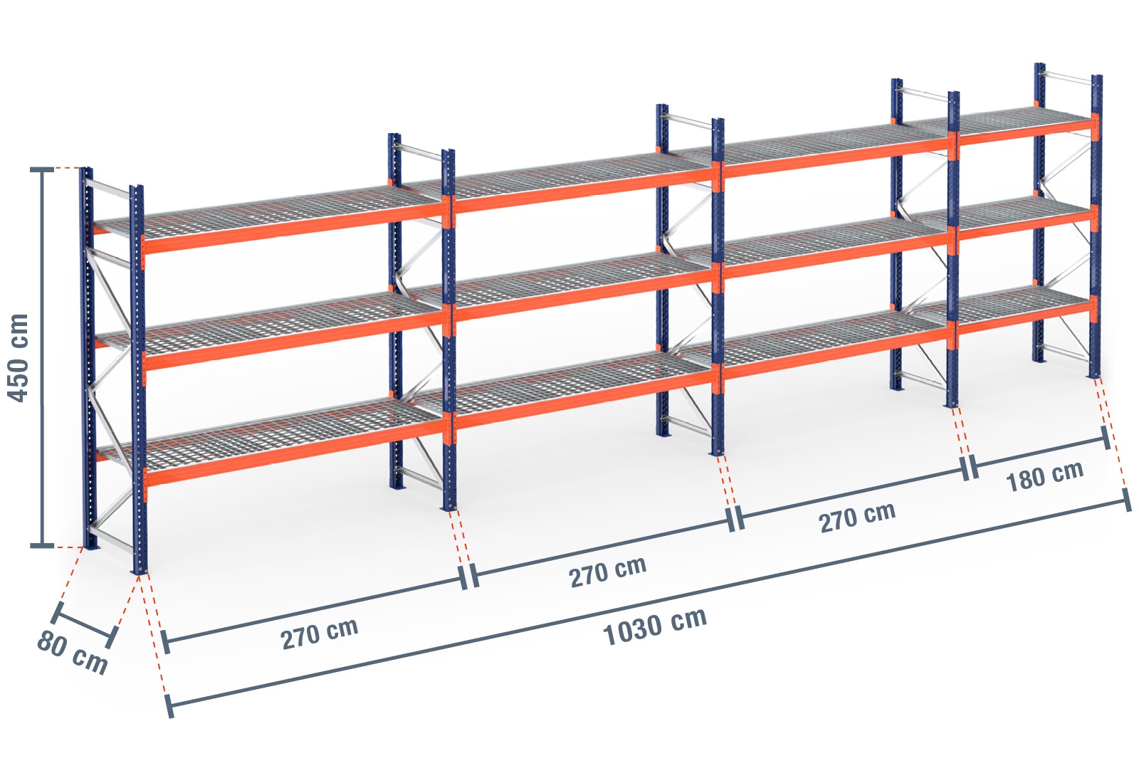 10,3 m Palettenregal PR9000 / 80 cm tief / 4,5 m hoch / 3 Ebenen / Auflage Gitterrost