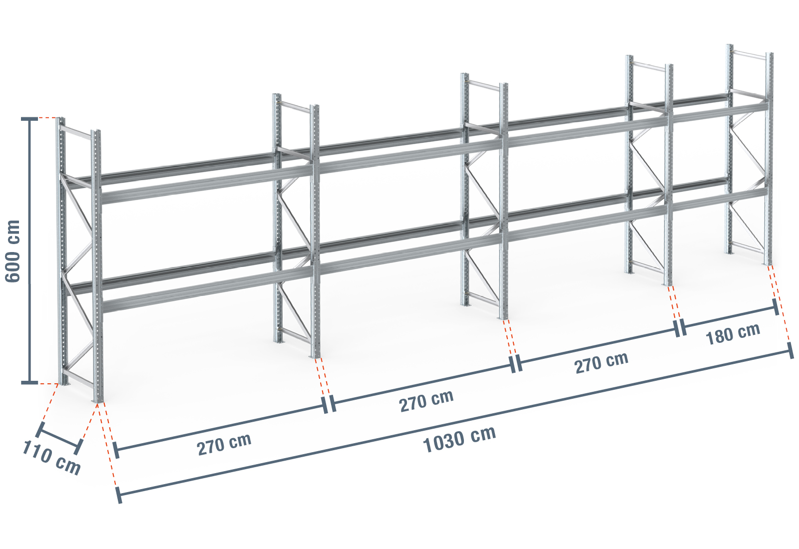 10,3 m Palettenregal PR9000F Feuerverzinkt / 110 cm tief / 6 m hoch / 2 Ebenen für 33 Europaletten