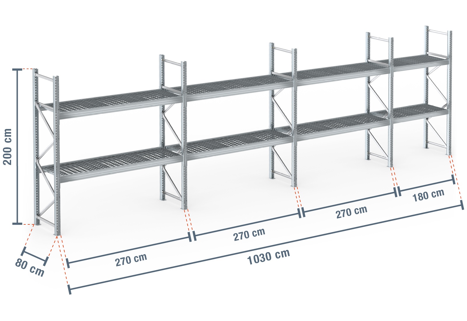 10,3 m Palettenregal PR9000F Feuerverzinkt / 80 cm tief / 2 m hoch / 2 Ebenen / Auflage Gitterrost