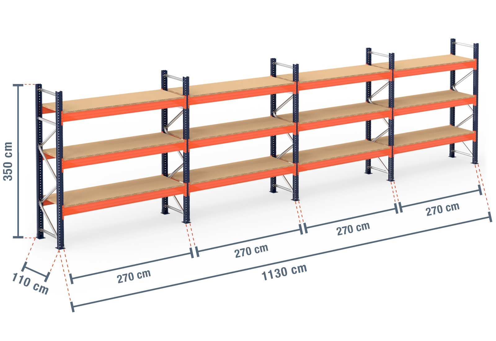 11,3 m Palettenregal PR15000 / 110 cm tief / 3,5 m hoch / 3 Ebenen / Auflage Holz