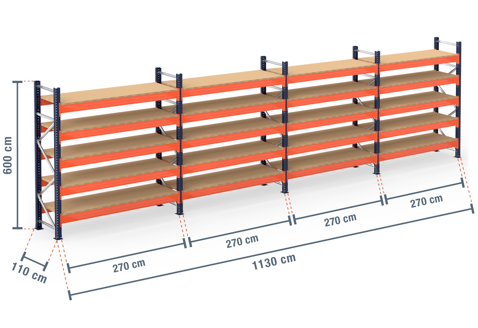 11,3 m Palettenregal PR15000 / 110 cm tief / 6 m hoch / 5 Ebenen / Auflage Holz