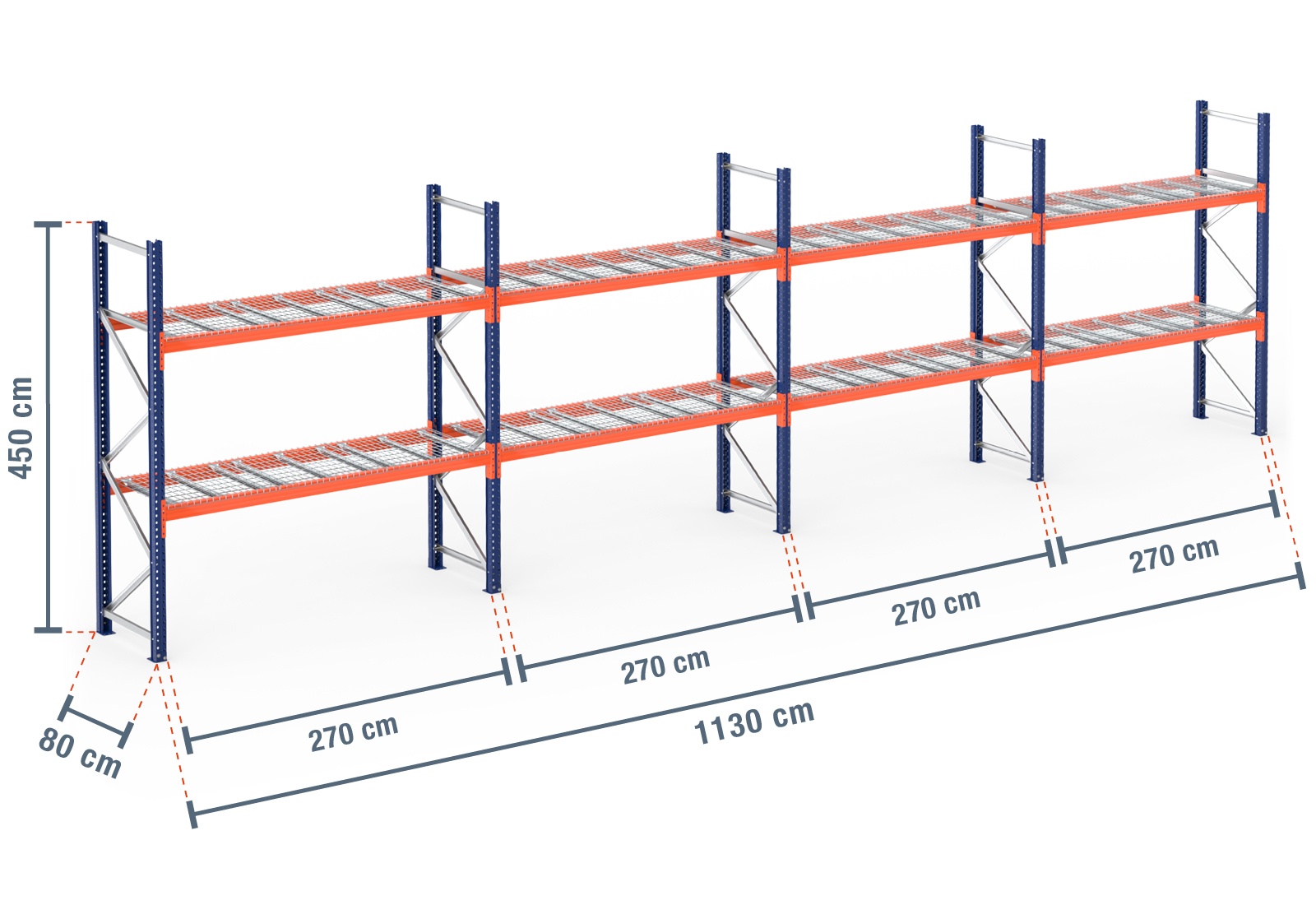 11,3 m Palettenregal PR9000 / 80 cm tief / 4,5 m hoch / 2 Ebenen / Auflage Drahtgitter