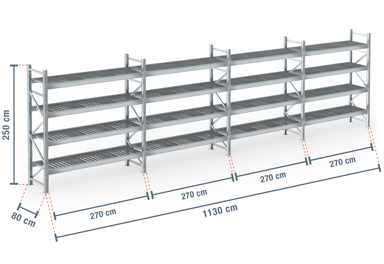 11,3 m Palettenregal PR9000F Feuerverzinkt / 80 cm tief / 2,5 m hoch / 4 Ebenen / Auflage Gitterrost