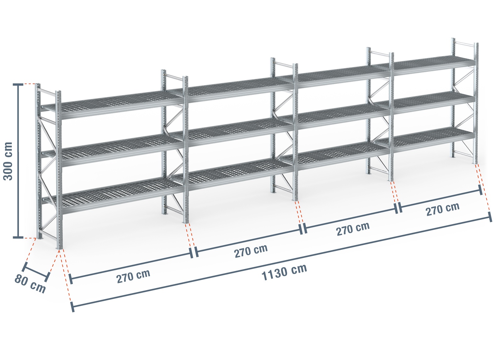 11,3 m Palettenregal PR9000F Feuerverzinkt / 80 cm tief / 3 m hoch / 3 Ebenen / Auflage Gitterrost