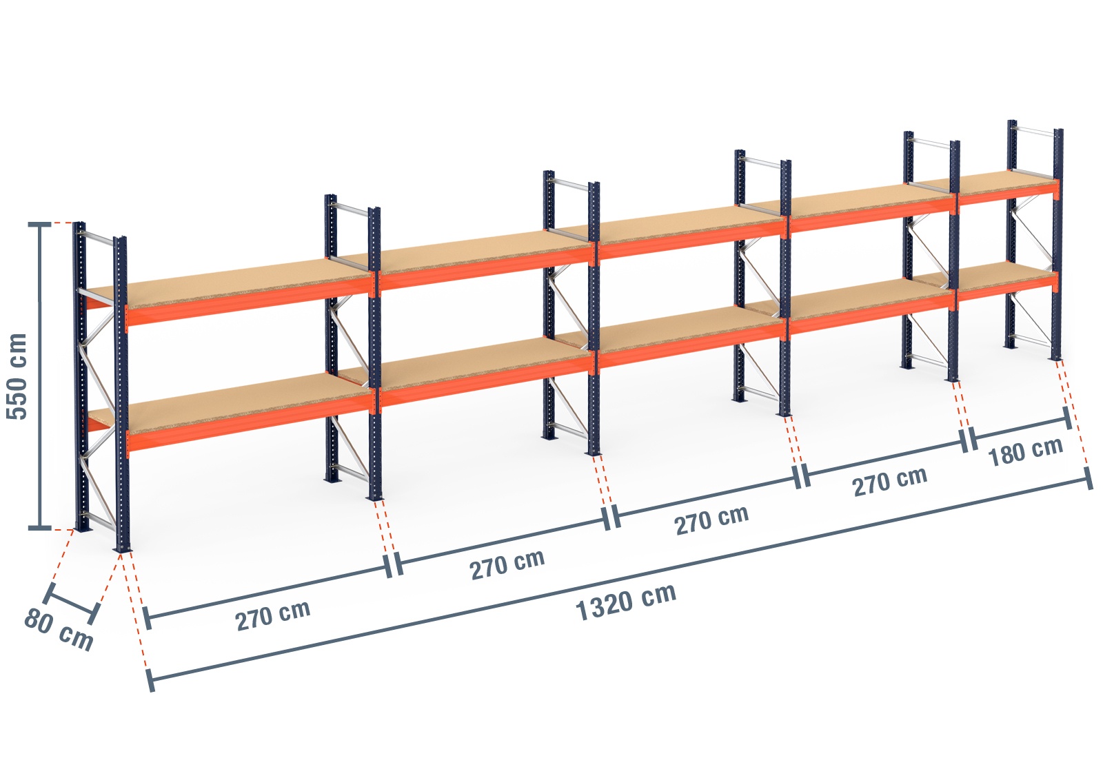 13,2 m Palettenregal PR15000 / 80 cm tief / 5,5 m hoch / 2 Ebenen / Auflage Holz