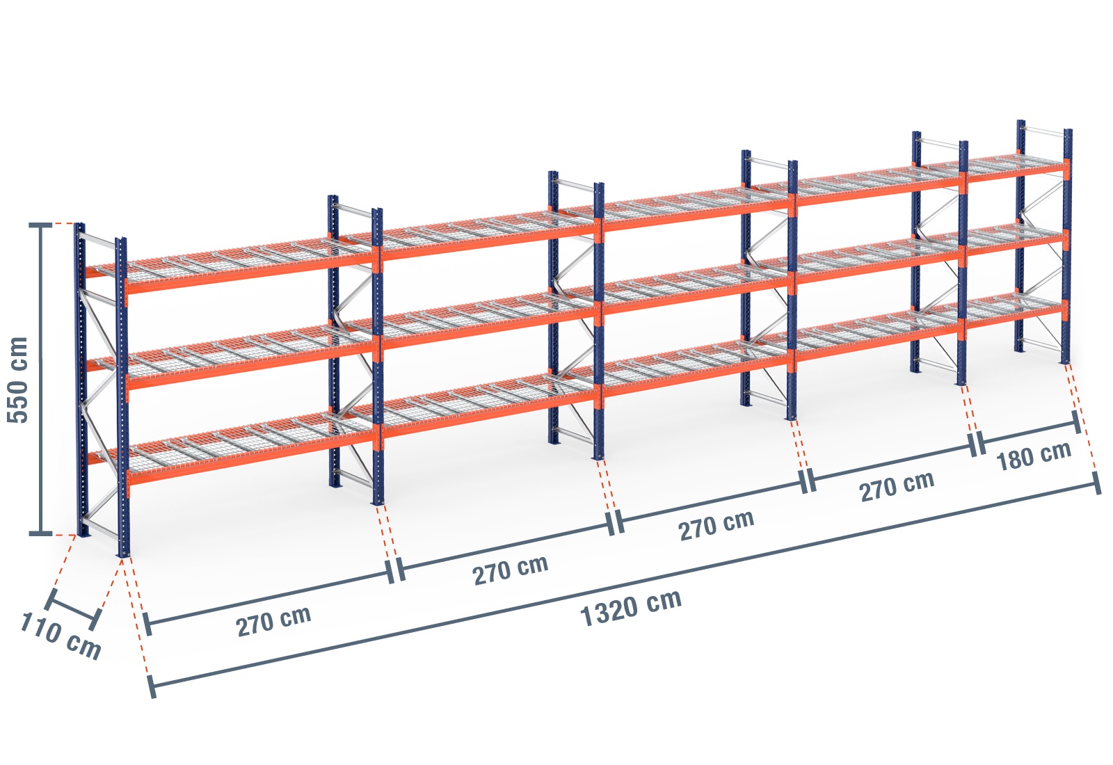 13,2 m Palettenregal PR4500 / 110 cm tief / 5,5 m hoch / 3 Ebenen / Auflage Drahtgitter