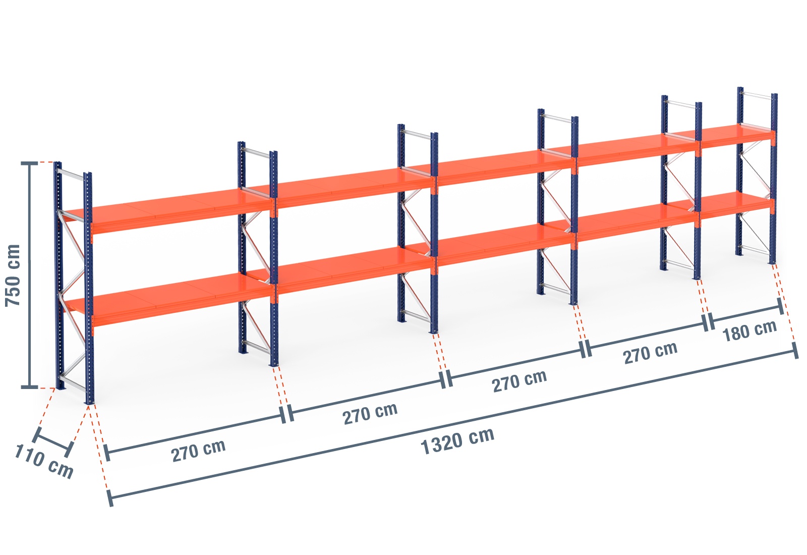13,2 m Palettenregal PR4500 / 110 cm tief / 7,5 m hoch / 2 Ebenen / Auflage Stahl