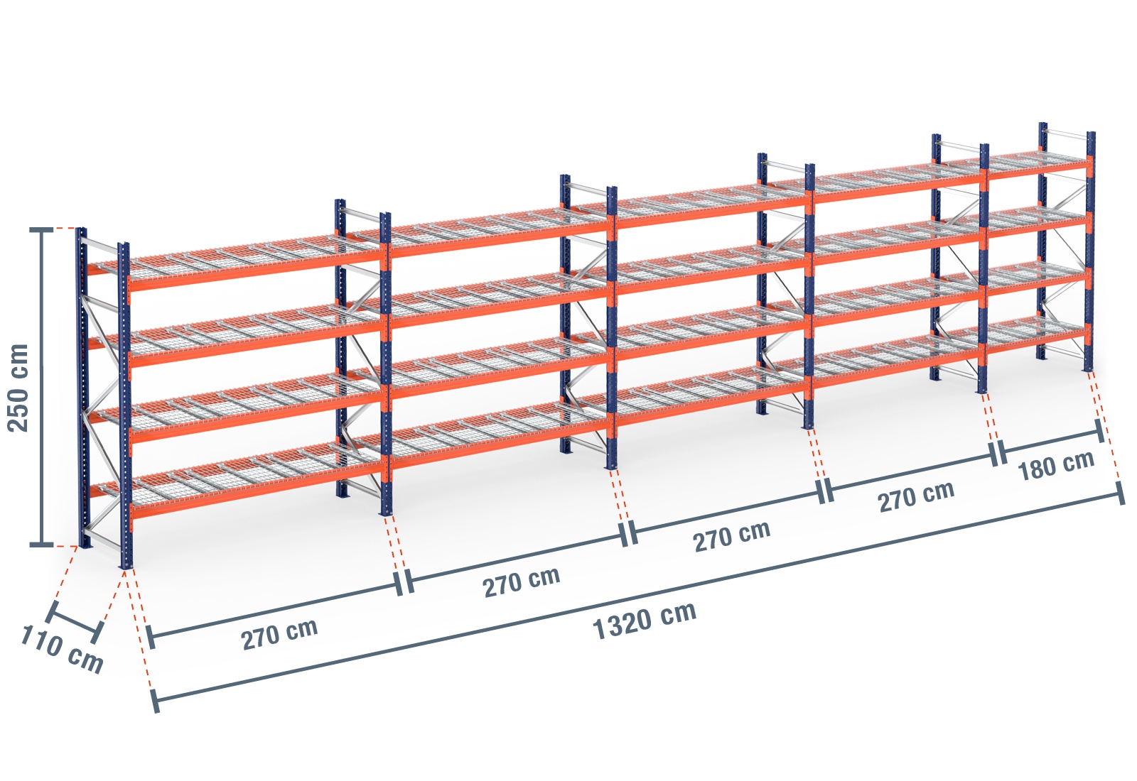 13,2 m Palettenregal PR9000 / 110 cm tief / 2,5 m hoch / 4 Ebenen / Auflage Drahtgitter