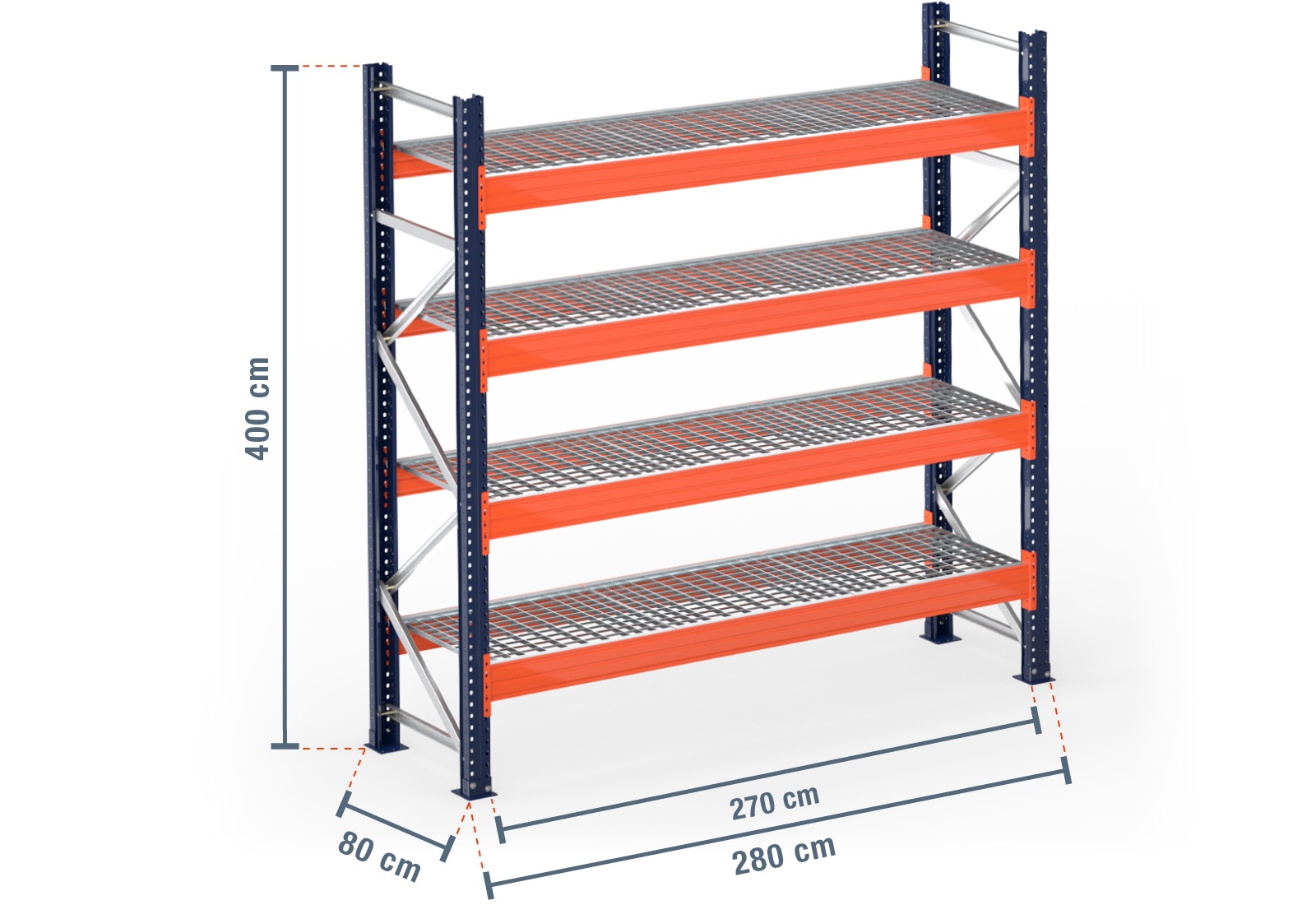 2,8 m Palettenregal PR15000 / 80 cm tief / 4 m hoch / 4 Ebenen / Auflage Gitterrost