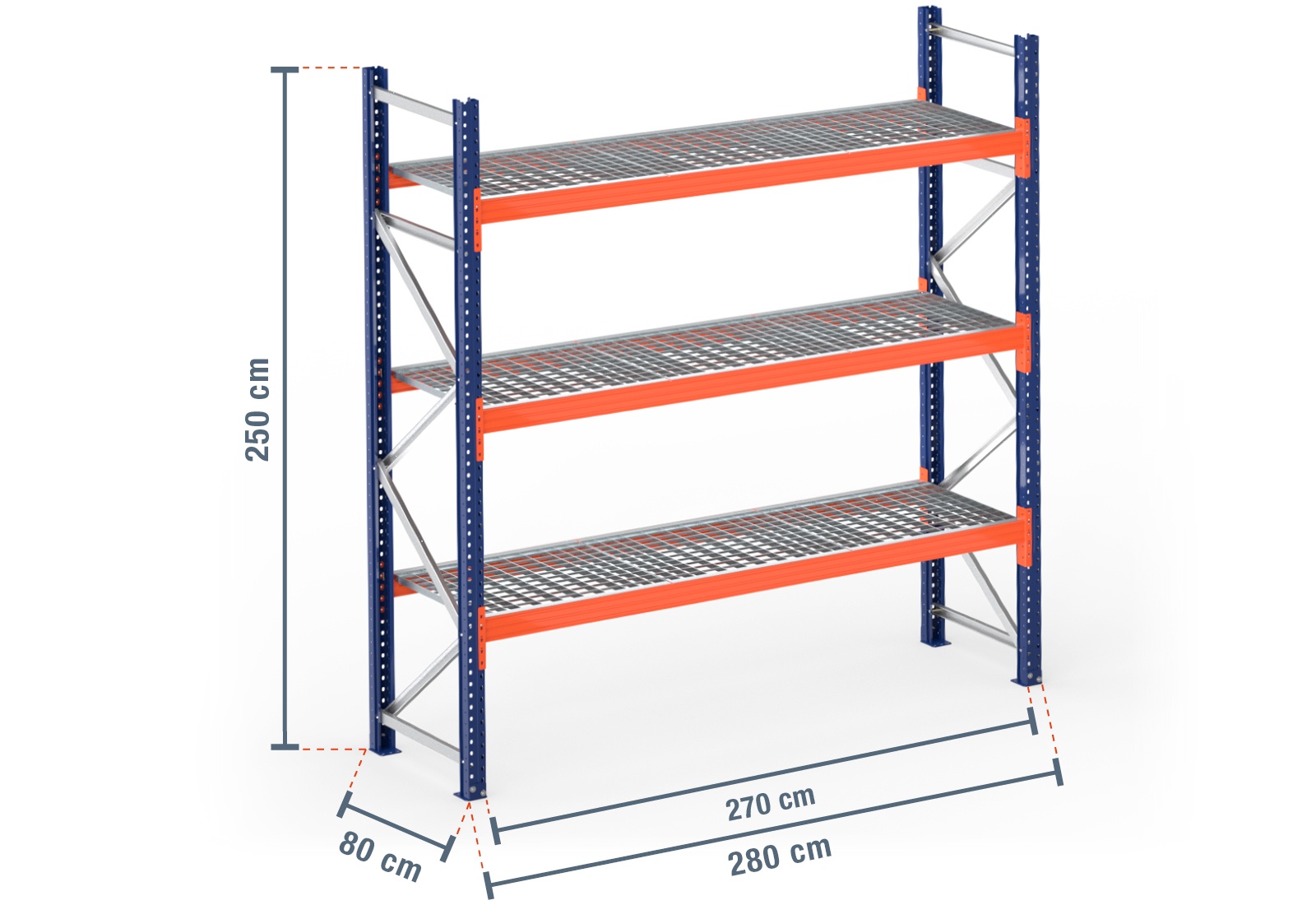 2,8 m Palettenregal PR4500 / 80 cm tief / 2,5 m hoch /3 Ebenen / Auflage Gitterrost