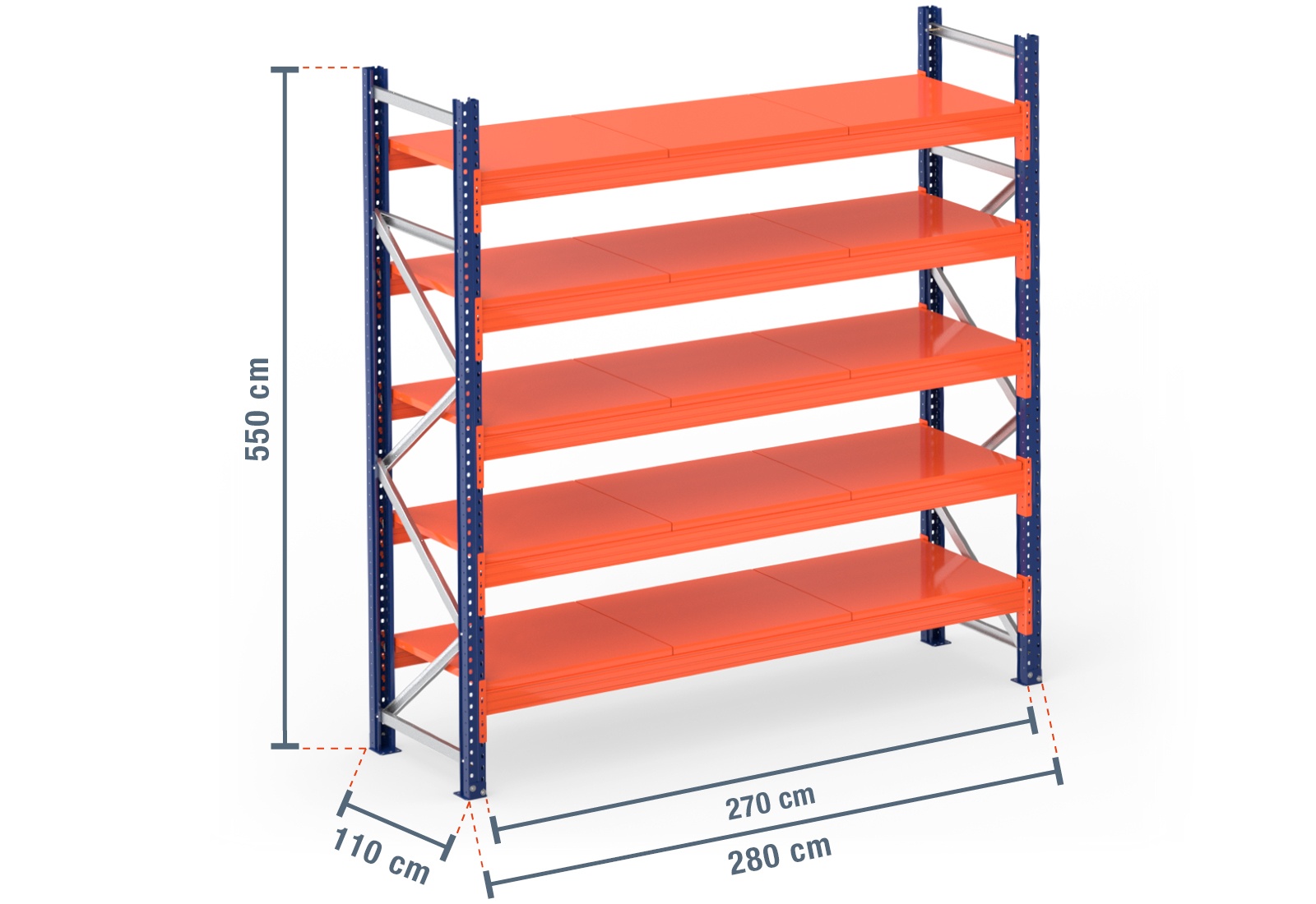2,8 m Palettenregal PR9000 / 110 cm tief / 5,5 m hoch / 5 Ebenen / Auflage Stahl