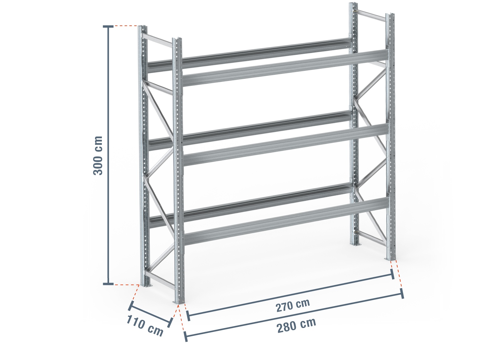 2,8 m Palettenregal PR9000F Feuerverzinkt / 110 cm tief / 3 m hoch / 3 Ebenen für 12 Europaletten