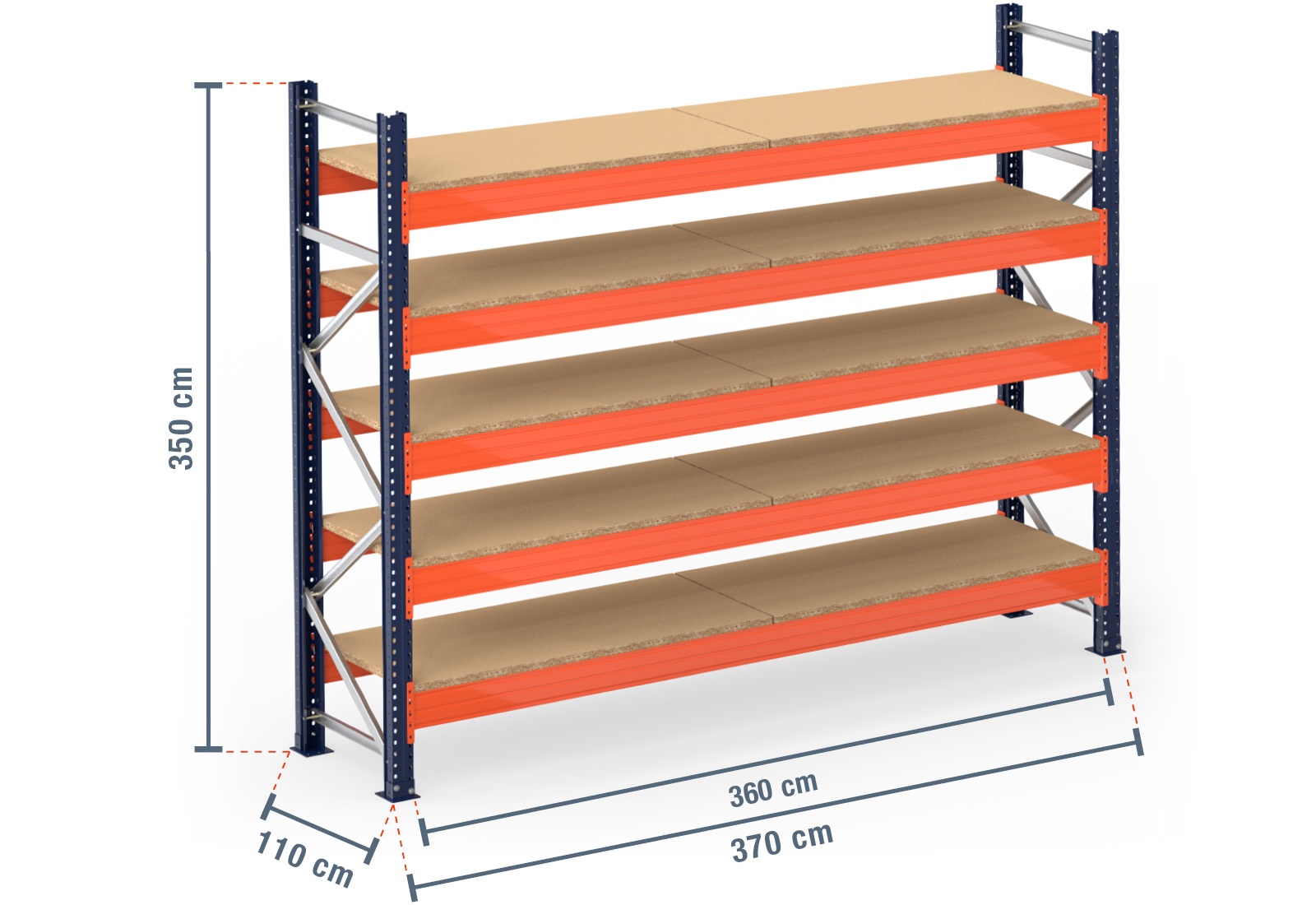 3,7 m Palettenregal PR15000 / 110 cm tief / 3,5 m hoch / 5 Ebenen / Auflage Holz