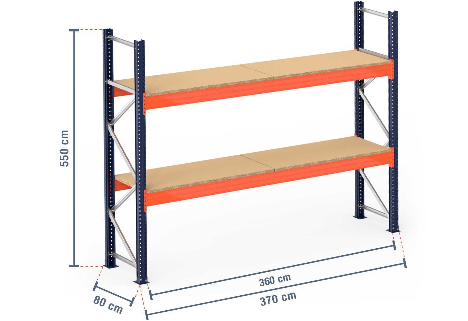 3,7 m Palettenregal PR15000 / 80 cm tief / 5,5 m hoch / 2 Ebenen / Auflage Holz