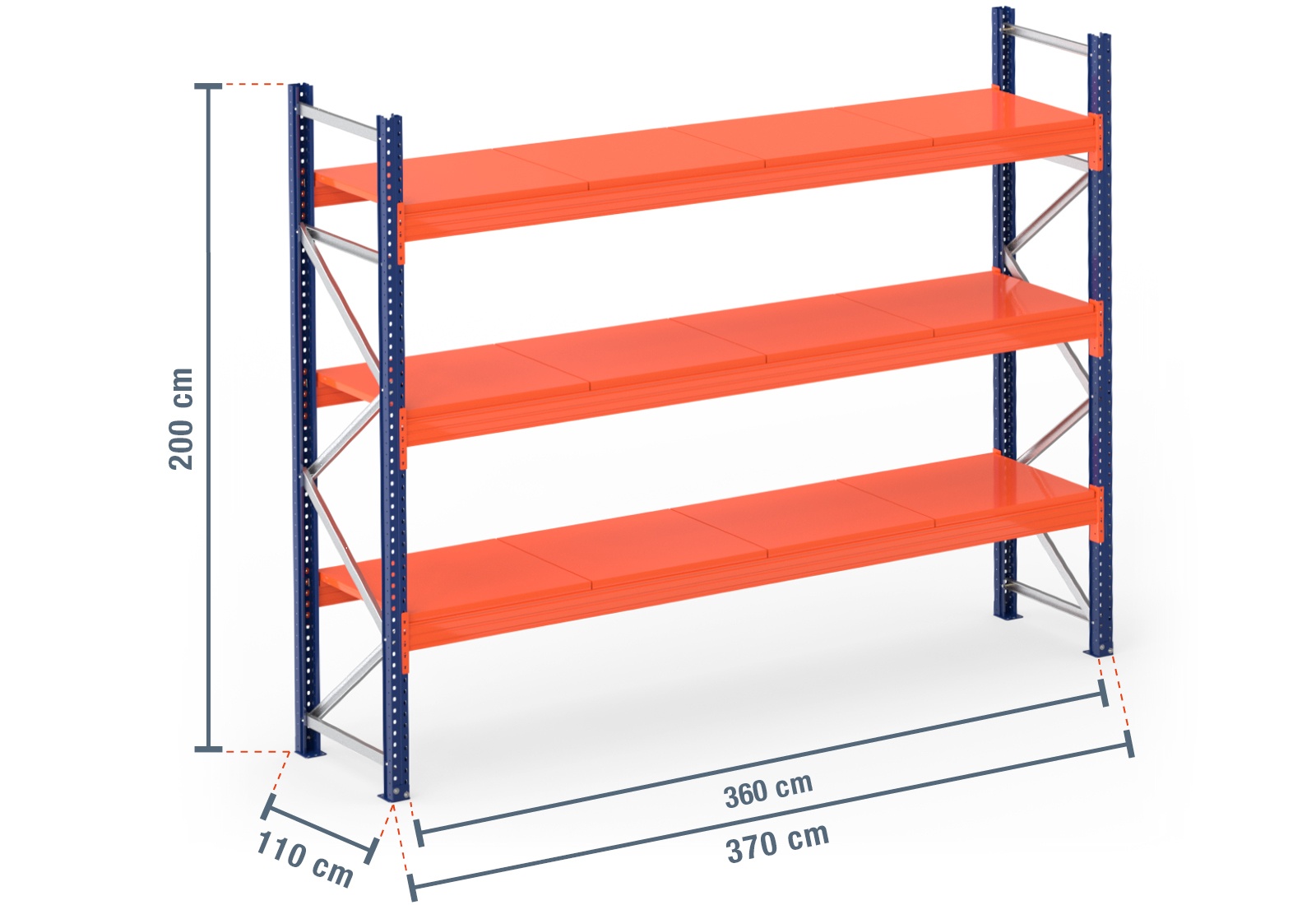 3,7 m Palettenregal PR4500 / 110 cm tief / 2 m hoch / 3 Ebenen / Auflage Stahl