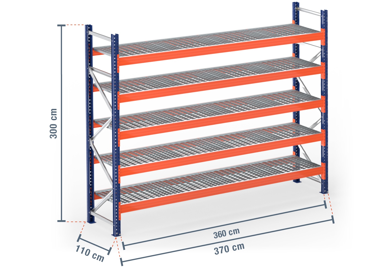 3,7 m Palettenregal PR9000 / 110 cm tief / 3 m hoch / 5 Ebenen / Auflage Gitterrost