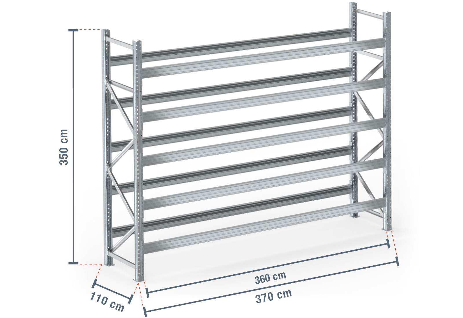 3,7 m Palettenregal PR9000F Feuerverzinkt / 110 cm tief / 3,5 m hoch / 5 Ebenen für 24 Europaletten
