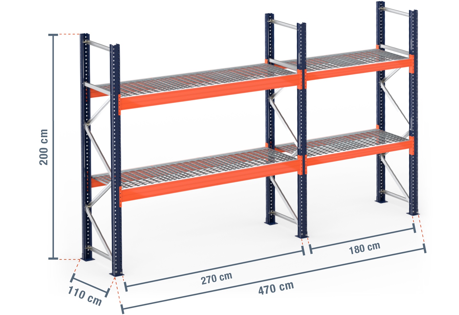 4,7 m Palettenregal PR15000 / 110 cm tief / 2 m hoch / 2 Ebenen / Auflage Gitterrost