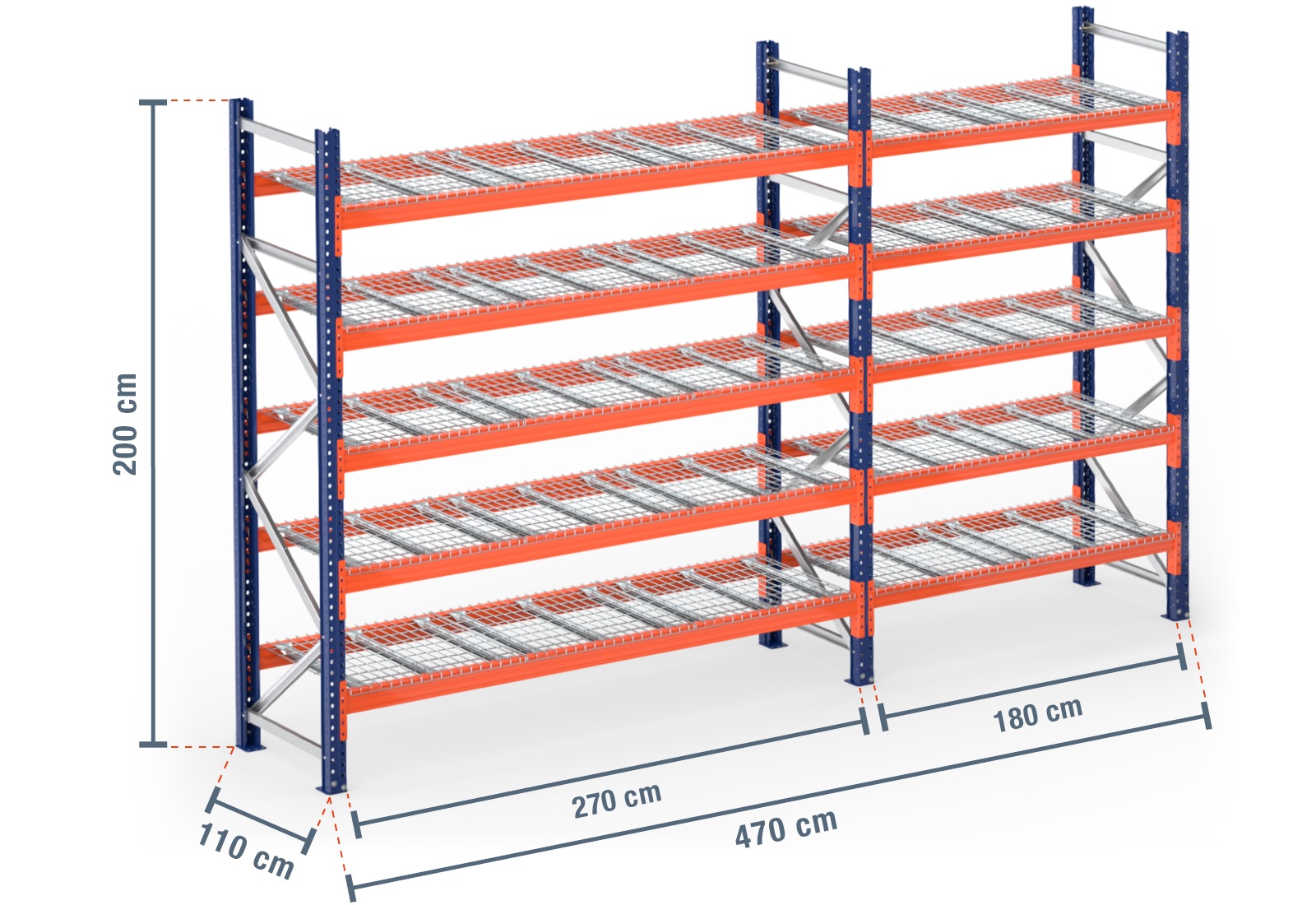 4,7 m Palettenregal PR9000 / 110 cm tief / 2 m hoch / 5 Ebenen / Auflage Drahtgitter