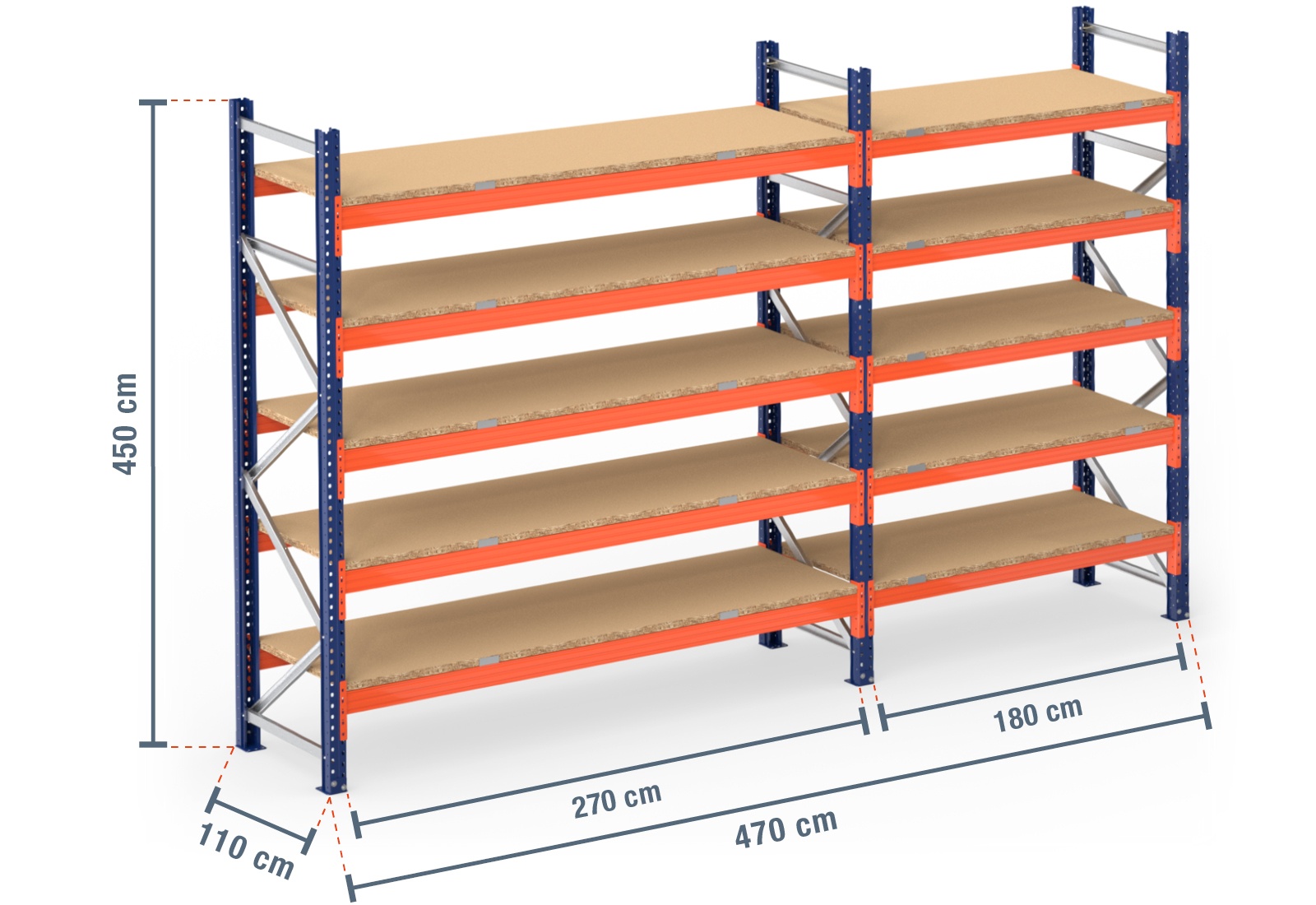 4,7 m Palettenregal PR9000 / 110 cm tief / 4,5 m hoch / 5 Ebenen / Auflage Holz