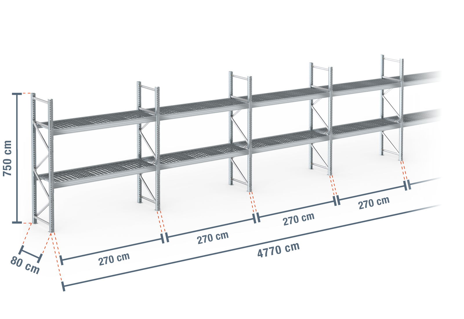 47,7 m Palettenregal PR9000F Feuerverzinkt / 80 cm tief / 7,5 m hoch / 2 Ebenen / Auflage Gitterrost