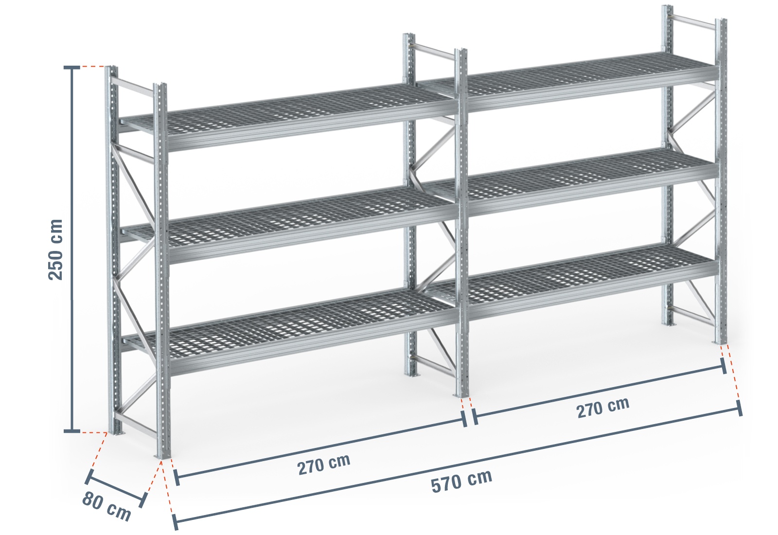 5,7 m Palettenregal PR9000F Feuerverzinkt / 80 cm tief / 2,5 m hoch / 3 Ebenen / Auflage Gitterrost