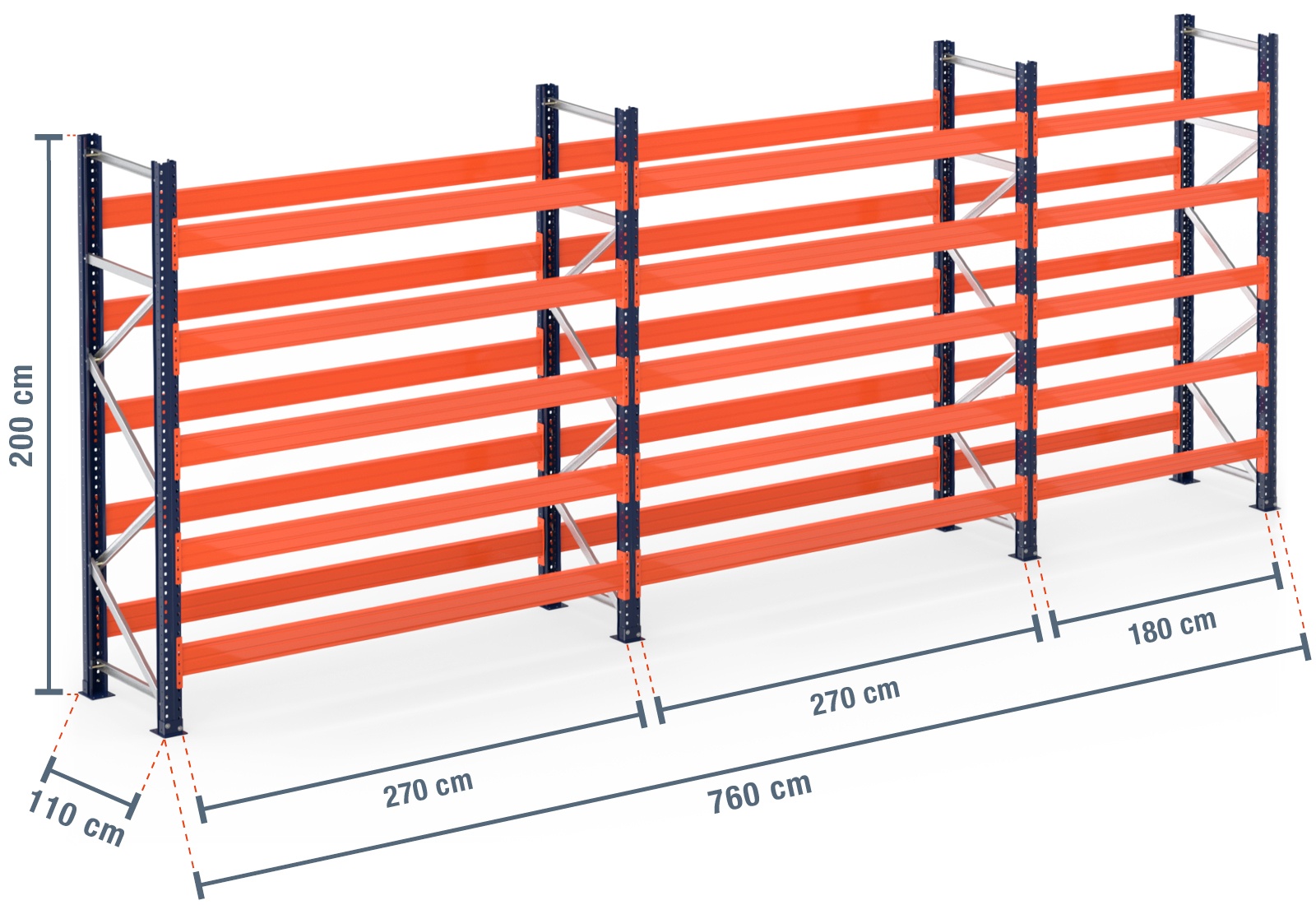 7,6 m Palettenregal PR15000 / 110 cm tief / 2 m hoch / 5 Ebenen für 48 Europaletten