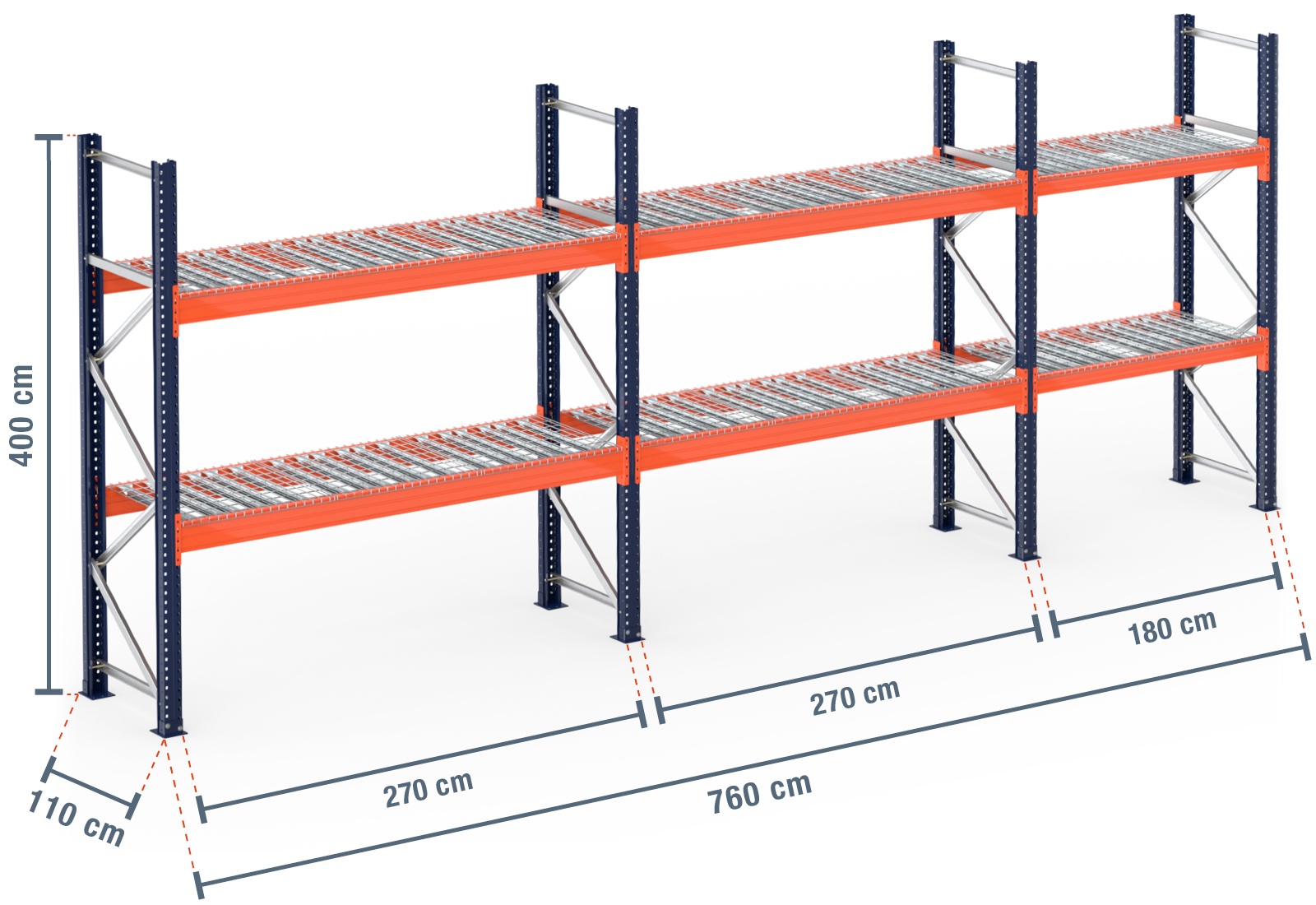 7,6 m Palettenregal PR15000 / 110 cm tief / 4 m hoch / 2 Ebenen / Auflage Drahtgitter