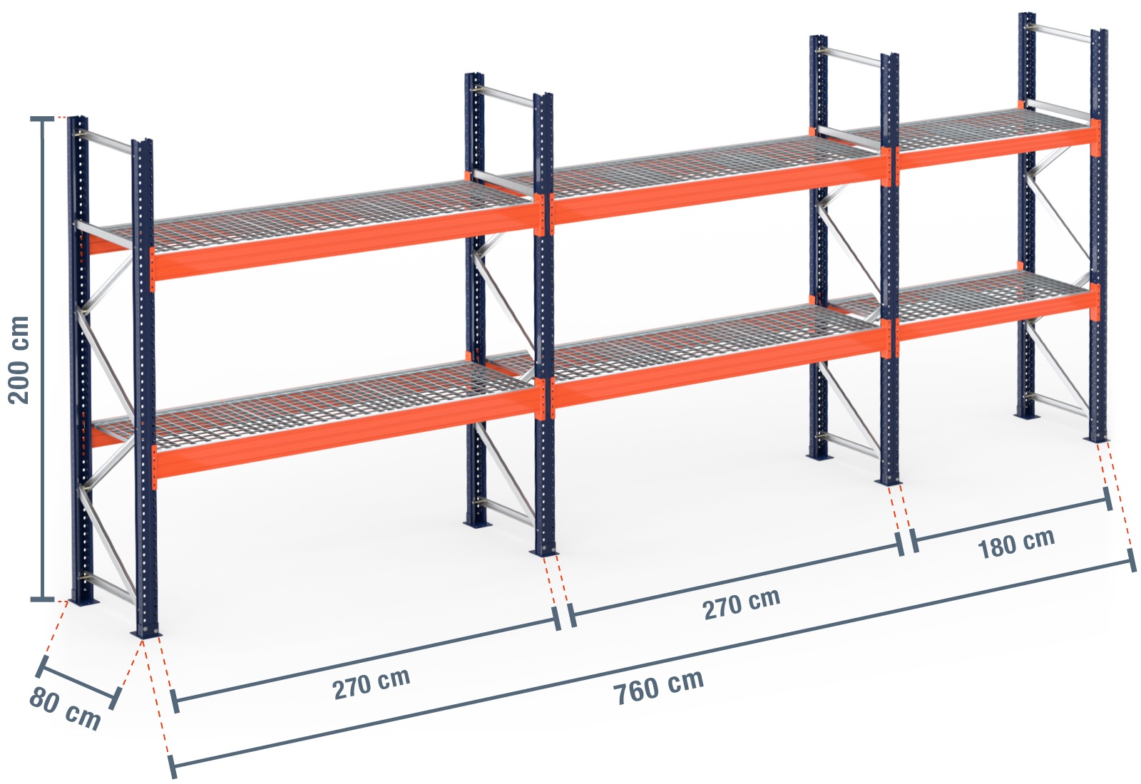 7,6 m Palettenregal PR15000 / 80 cm tief / 2 m hoch / 2 Ebenen / Auflage Gitterrost
