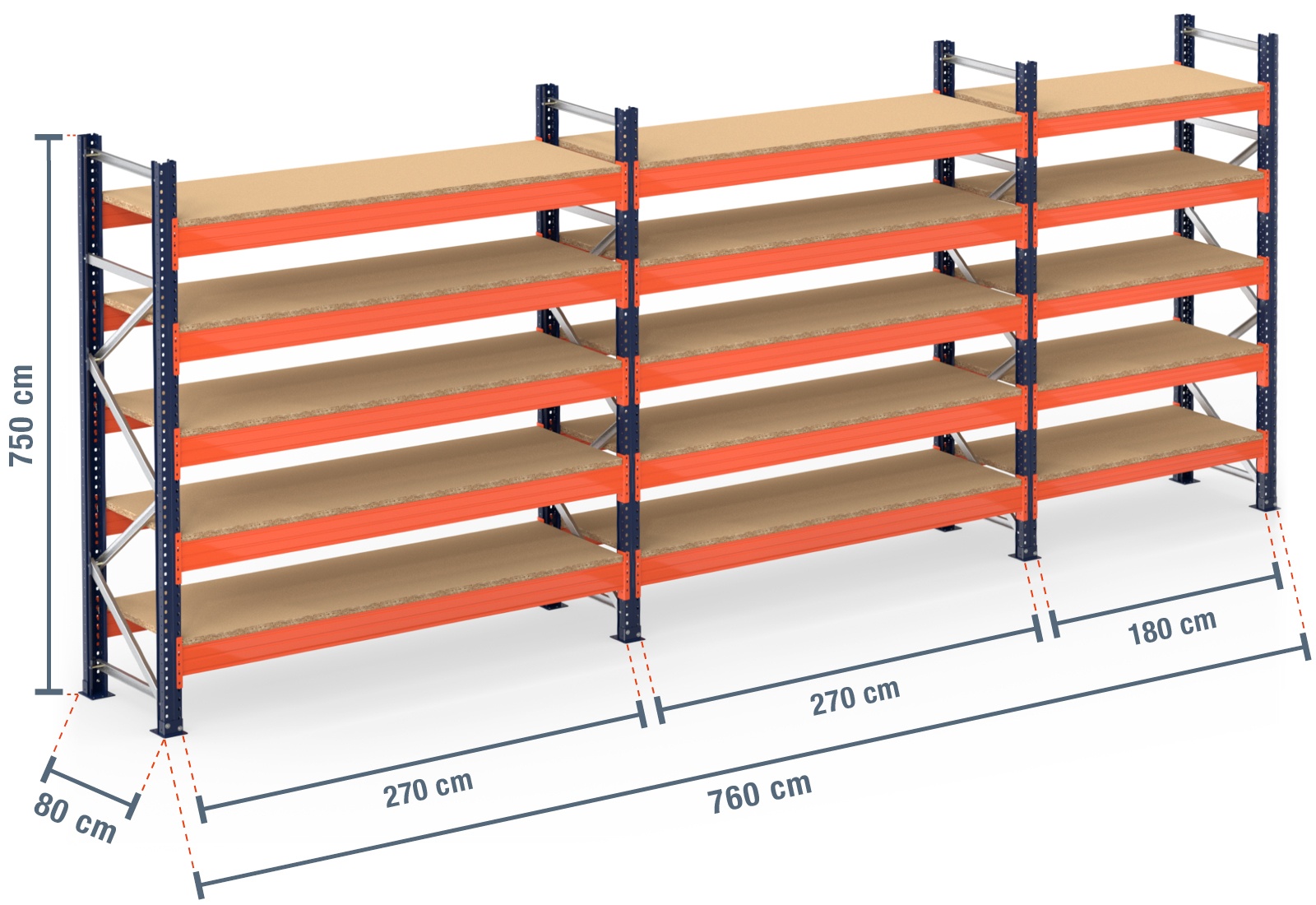 Ausgesprochen interessant ist die Flexibilität der Regale. Die Traversen können in einem Raster von 50 mm individuell in der Höhe eingehängt werden, um so verschieden große Regalfächer zu erhalten. Außerdem lassen sich in unserem Konfigurator auch unterschiedliche Fachbreiten und Regalhöhen miteinander kombinieren, um Ihren individuellen Bedürfnissen gerecht zu werden. Auch nachträglich können Anbauten in Form von weiteren Regalfächern in der Breite von 180 cm, 270 cm und 360 cm oder einem Arbeitstisch vorgenommen werden. Auch das Einhängen weiterer Ebenen in der Höhe ist möglich.