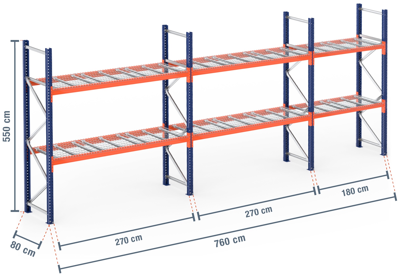 7,6 m Palettenregal PR4500 / 80 cm tief / 5,5 m hoch / 2 Ebenen / Auflage Drahtgitter