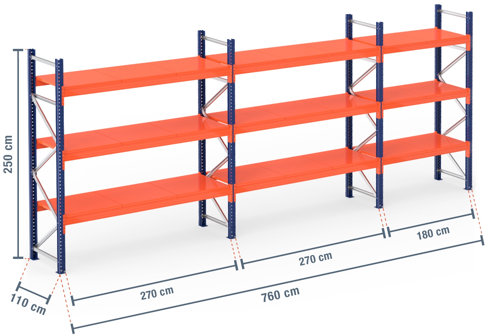 7,6 m Palettenregal PR9000 / 110 cm tief / 2,5 m hoch / 3 Ebenen / Auflage Stahl